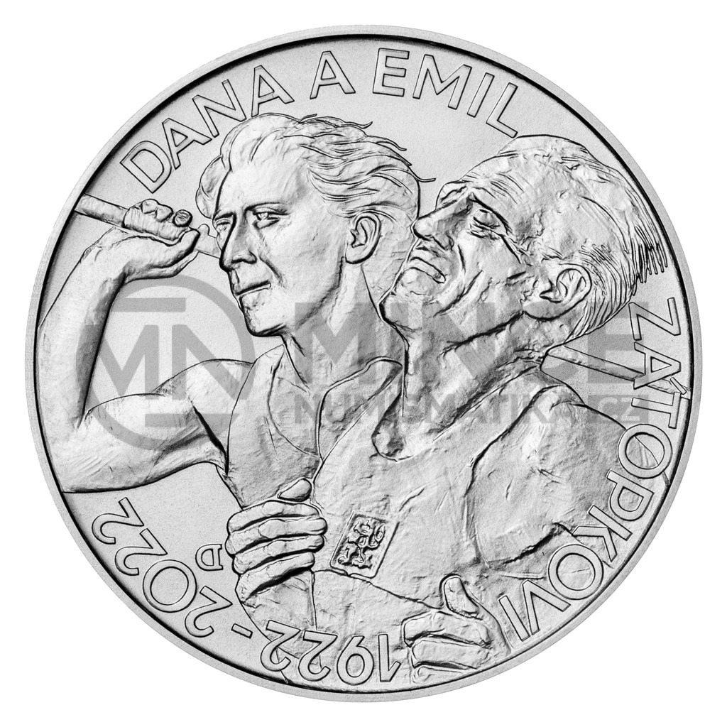 Na rubové straně dvousetkoruny jsou portréty Dany a Emila Zátopkových. Po obvodu mince jsou v neúplném opisu texty „DANA A EMIL“, „ZÁTOPKOVI“ a „1922-2022“. Iniciála autora mince Vojtěcha Dostála, DiS., která je tvořena obráceným písmenem „D“, je umístěna nad textem „2022“.