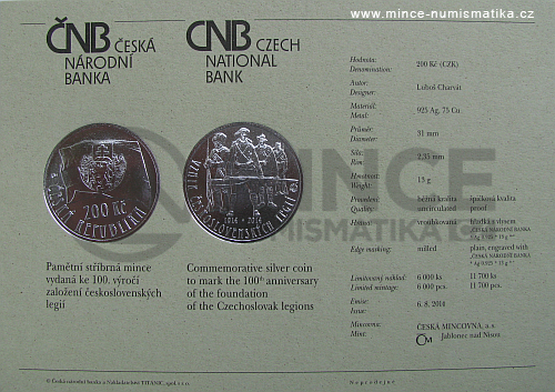 Mince uložena v kapsli a etuji (proof kvalita), ke každé minci se dodává katalogová karta zelené barvy, na níž je popis mince a její plastické vyobrazení. Text je dvojjazyčný v češtině a angličtině. Karta je společná oběma provedením mince.