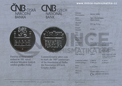 Na rubové straně dvousetkoruny je v horní části mince umístěno logo sdružení „Hollar“, pod kterým je zobrazen válec tiskařského lisu. Ve spodní polovině mince je v šesti řádcích text „SDRUŽENÍ ČESKÝCH UMĚLCŮ GRAFIKŮ HOLLAR“ a letopočty „1917 – 2017“. Při spodním okraji dvousetkoruny se nacházejí iniciály autora mince MgA. Martina Daška, které jsou tvořeny spojenými písmeny „M“ a „D“.