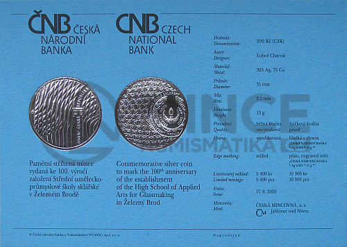 Na lícní straně dvousetkoruny je vyobrazen broušený talíř z olovnatého křišťálu, ve kterém je zakomponován fragment vstupního portálu školy. Označení nominální hodnoty se zkratkou peněžní jednotky "200 Kč" a text "ČESKÁ REPUBLIKA" se nachází uvnitř fragmentu vstupního portálu. Značka České mincovny tvořená písmeny "Č" a "M" je umístěna při levém okraji mince.