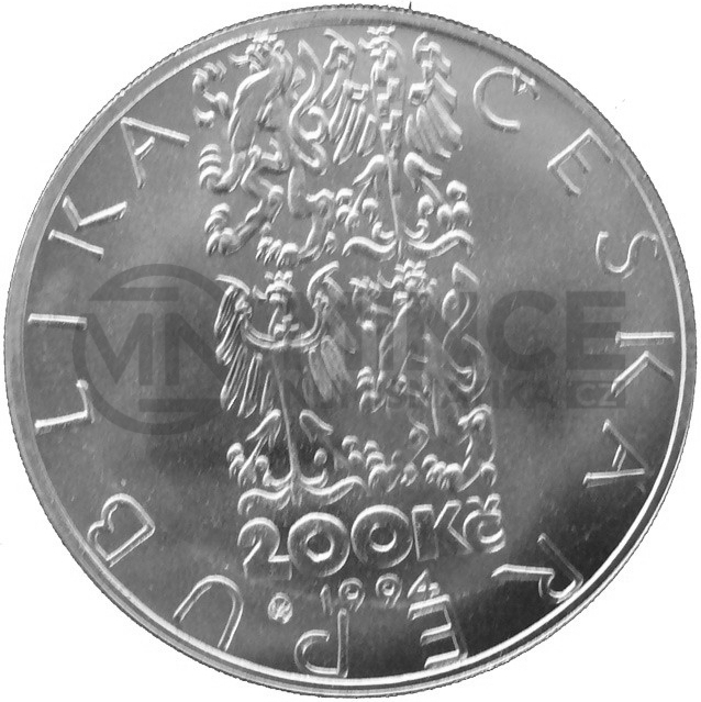 Dominantou lícní strany je stylizovaný velký státní znak České republiky. Znak je umístěn blíže k hornímu okraji mince. Název státu "ČESKÁ REPUBLIKA"je v neuzavřeném opisu při okraji mince. Nominální hodnota mince "200 Kč" se nachází pod státním znakem. V řádku pod ní je uveden letopočet ražby "1994". Značka Státní mincovny v Kremnici, která minci razila, je umístěna pod číslicí "2" hodnoty mince.