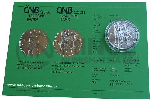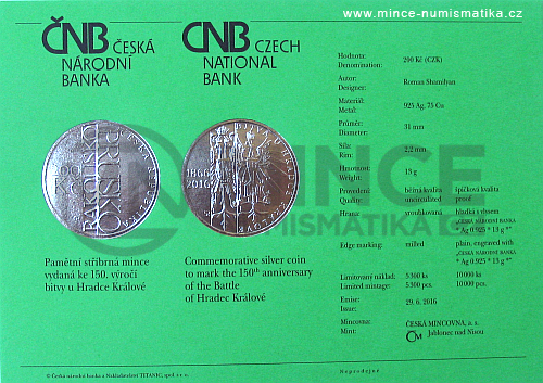 Mince uložena v kapsli a etuji (proof kvalita), ke každé minci se dodává katalogová karta zelené barvy, na níž je popis mince a její plastické vyobrazení. Text je dvojjazyčný v češtině a angličtině. Karta je společná oběma provedením mince.