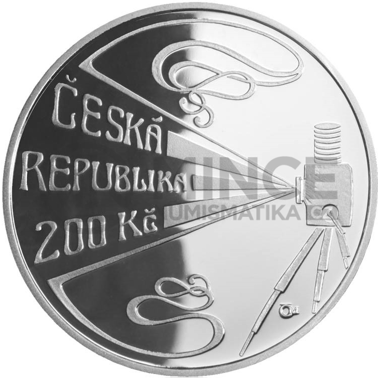 Na lícní straně dvousetkoruny je zobrazen promítací přístroj, ze kterého vycházejí stylizované paprsky světla. Mezi nimi je umístěn secesně stylizovaným písmem název státu „ČESKÁ REPUBLIKA“ a označení nominální hodnoty mince se zkratkou peněžní jednotky „200 Kč“. Značka České mincovny je umístěna při spodním okraji dvousetkoruny mezi nohami stojanu promítacího přístroje.