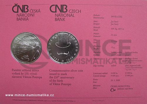 Na rubové straně dvousetkoruny jsou symbolické znaky Viktora Ponrepa – klobouk a knír. Při levém a pravém okraji dvousetkouny je neuzavřený opis „VIKTOR PONREPO“ a při jejím spodním okraji jsou letopočty „1858-2008“. Autorem návrhu dvousetkoruny je pan Jan Smrž. Jeho iniciály tvořené spojenými písmeny „JS“ jsou umístěny při levém okraji dvousetkoruny u písmene „O“ ve jménu „VIKTOR“ mezi tímto písmenem a kloboukem.