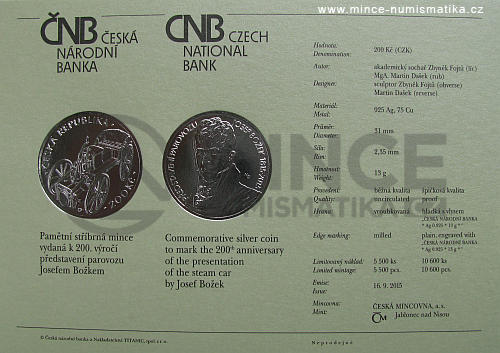 Na lícní straně mince je zobrazen parovůz sestrojený Josefem Božkem. Při levém horním okraji dvousetkoruny je název státu „ČESKÁ REPUBLIKA“. Označení nominální hodnoty mince se zkratkou peněžní jednotky „200 Kč“ je při pravém okraji dvousetkoruny. Název státu a označení nominální hodnoty mince jsou na začátku a na konci ohraničeny tečkami. Značka České mincovny tvořená kompozicí písmen „Č“ a „M“ je při spodním okraji dvousetkoruny. Nad značkou České mincovny jsou iniciály autora lícní strany dvousetkoruny akademického sochaře Zbyňka Fojtů, které jsou tvořeny spojenými písmeny „FZ“.