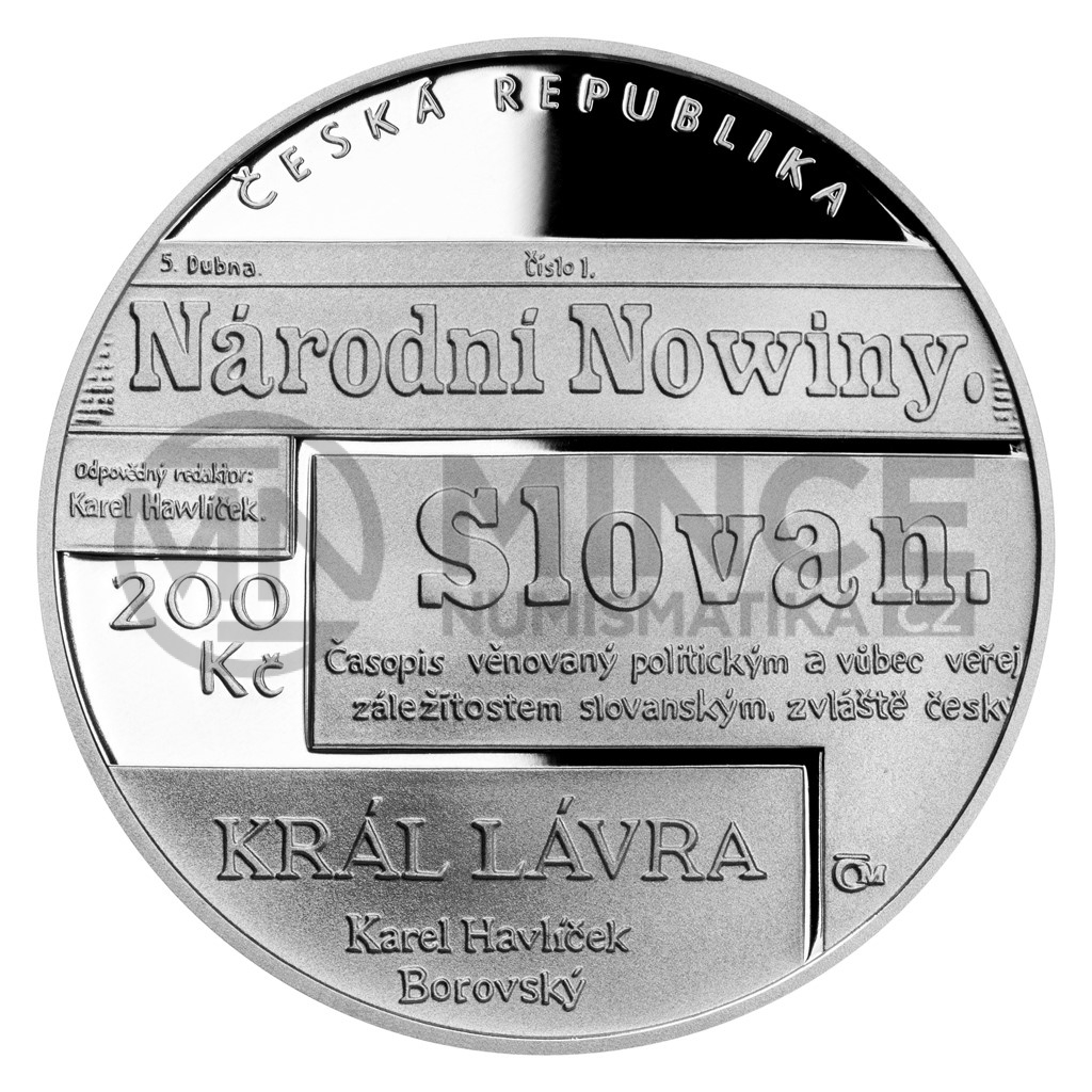 Na lícní straně dvousetkoruny jsou ztvárněny fragmenty titulních listů novin Karla Havlíčka Borovského a název jednoho z jeho literárních děl. Při horním okraji mince je v opisu text "ČESKÁ REPUBLIKA" a při levém okraji mince se nachází označení nominální hodnoty se zkratkou peněžní jednotky "200 Kč". Značka České mincovny tvořená písmeny "Č" a "M" je umístěna při pravém spodním okraji mince.