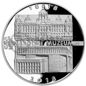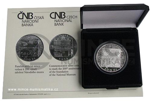 Na lícní straně dvousetkoruny jsou ztvárněny dvě pomyslné vitríny, které obsahují vybrané exponáty Národního muzea. V horní vitríně jsou znázorněny kostra plejtváka myšoka, zkamenělina trilobita a kamenná plastika hlavy Kelta ze Mšeckých Žehrovic. Ve spodní vitríně se nacházejí vakovlk, ještěr velescink kapverdský a denár Boleslava II. Mezi vitrínami je název státu „ČESKÁ REPUBLIKA“. Mincovní pole při horním, levém a pravém okraji je vyplněno názvy objektů, které jsou ve správě Národního muzea. Označení nominální hodnoty mince se zkratkou peněžní jednotky „200 Kč“ se nachází při spodním okraji mince. Značka České mincovny tvořená písmeny „Č“ a „M“ je umístěna pod hlavou vakovlka.