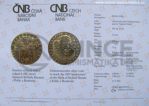Na lícní straně mince je vyobrazen výřez titulní strany cestopisu Kryštofa Haranta z Polžic a Bezdružic „Putování aneb cesta z Království českého do Benátek, odtud po moři do země Svaté, země judské a dále do Egypta“, přes kterou je vyobrazen Kryštof Harant na velbloudu. Pod vyobrazením Kryštofa Haranta je jeho heslo „Virtus ut sol micat“ ztvárněné jako notový záznam. Vpravo od výřezu titulní strany je motiv mandolíny, vlevo je plachetnice na moři. Nad výřezem titulní strany je kompozice heraldických zvířat z velkého státního znaku ve štítech – uprostřed je český lev, vlevo moravská orlice a vpravo slezská orlice. Po obvodu mince je název státu „ČESKÁ REPUBLIKA“ a označení nominální hodnoty mince se zkratkou peněžní jednotky „200 Kč“. Minci razila Česká mincovna v Jablonci nad Nisou. Její značka tvořená kompozicí písmen „Č“ a „M“ je při spodním okraji mince. Celé mincovní pole je na lícní straně vyplněno dekorem čtyřcípých hvězd.