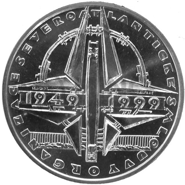 Na hraně mince v běžném provedení je vlys "ČESKÁ REPUBLIKA - ČLENSKÁ ZEMĚ NATO - 1999 -", mince ve zvláštním provedení má vlys "ČESKÁ NÁRODNÍ BANKA * Ag 0.900 * 13 g *". Na líci dvousetkoruny je stylizovaný velký státní znak České republiky bez štítu a pod ním název státu "ČESKÁ REPUBLIKA". Pod názvem státu je ve dvou řádcích označení nominální hodnoty mince se zkratkou peněžní jednotky "200 Kč". Lícní strana je doplněna značkou Bižuterie České Mincovny a.s., která dvousetkorunu razila. Značka je umístěna vpravo od státního znaku. Rub dvousetkoruny vyplňuje vyobrazení plastiky stojící před budovou NATO v Bruselu. Do vyobrazení jsou zakomponovány letopočty "1949" a "1999" a iniciála příjmení autora návrhu.