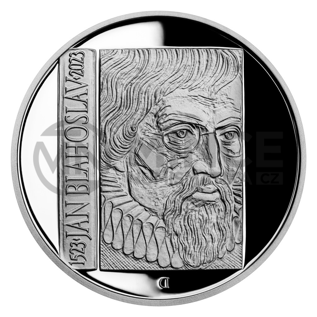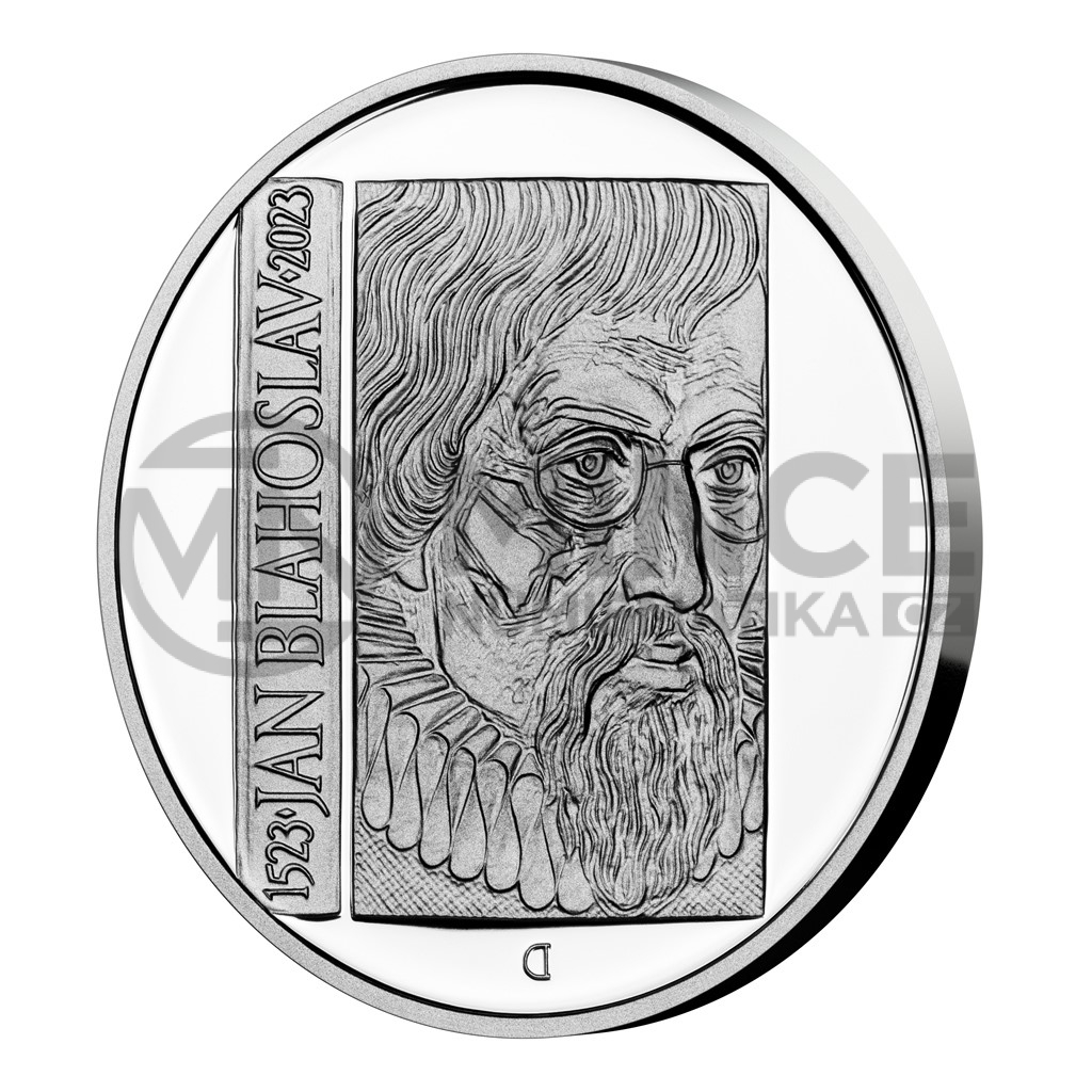 Na rubové straně dvousetkoruny je zachována kompozice lícní strany. Na místě titulní strany je ztvárněn portrét Jana Blahoslava a na hřbetu knihy se nachází text „1523 ♦ JAN BLAHOSLAV ♦ 2023“. Iniciála autora mince Vojtěcha Dostála, DiS., která je tvořena obráceným písmenem „D“, je umístěna při spodním okraji mince.