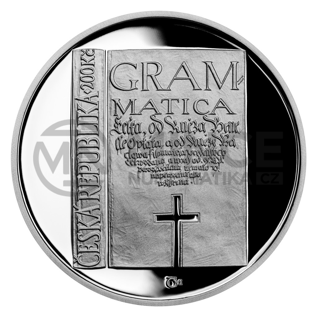 Na lícní straně dvousetkoruny je ztvárněna kompozice hřbetu a titulní strany knihy Gramatika česká z roku 1571. Titulní strana je doplněna o symbolický kříž. Na hřbetu knihy se nachází text „ČESKÁ REPUBLIKA ♦ 200 Kč“. Značka České mincovny tvořená písmeny „Č“ a „M“ je umístěna při spodním okraji mince.