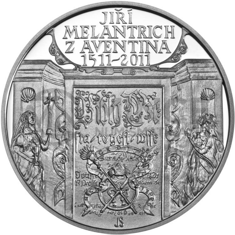 Na rubu dvousetkoruny je vyobrazení titulní strany Bible, vydané Jiřím Melantrichem z Aventina roku 1570, uprostřed je opět vydavatelův signet. Text „JIŘÍ MELANTRICH Z AVENTINA a letopočty 1511 – 2011 jsou ve výřezu nad titulní stranou bible. Kompozici opět doplňují ozdobné dekory, značka autora mince Jana Smrže, tvořená písmeny JS je při spodním okraji mince.