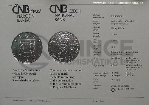 Mince uložena v kapsli a etuji (proof kvalita), ke každé minci se dodává katalogová karta světle šedé barvy, na níž je popis mince a její plastické vyobrazení. Text je dvojjazyčný v češtině a angličtině. Karta je společná oběma provedením mince.