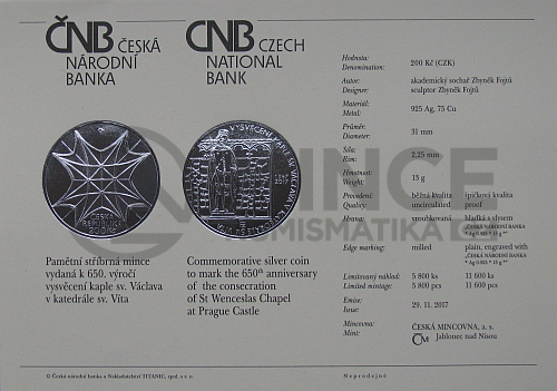 Mince uložena v kapsli a etuji (proof kvalita), ke každé minci se dodává katalogová karta smetanové barvy, na níž je popis mince a její plastické vyobrazení. Text je dvojjazyčný v češtině a angličtině. Karta je společná oběma provedením mince.