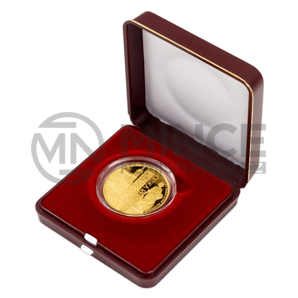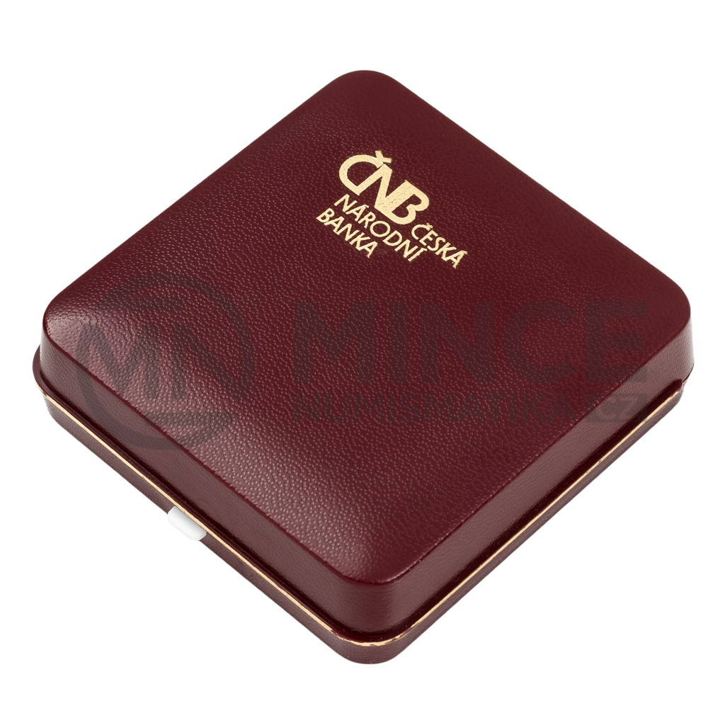 Mince uložena v kapsli a etue, přiložena katalogová karta ČNB červené barvy potvrzující její parametry.