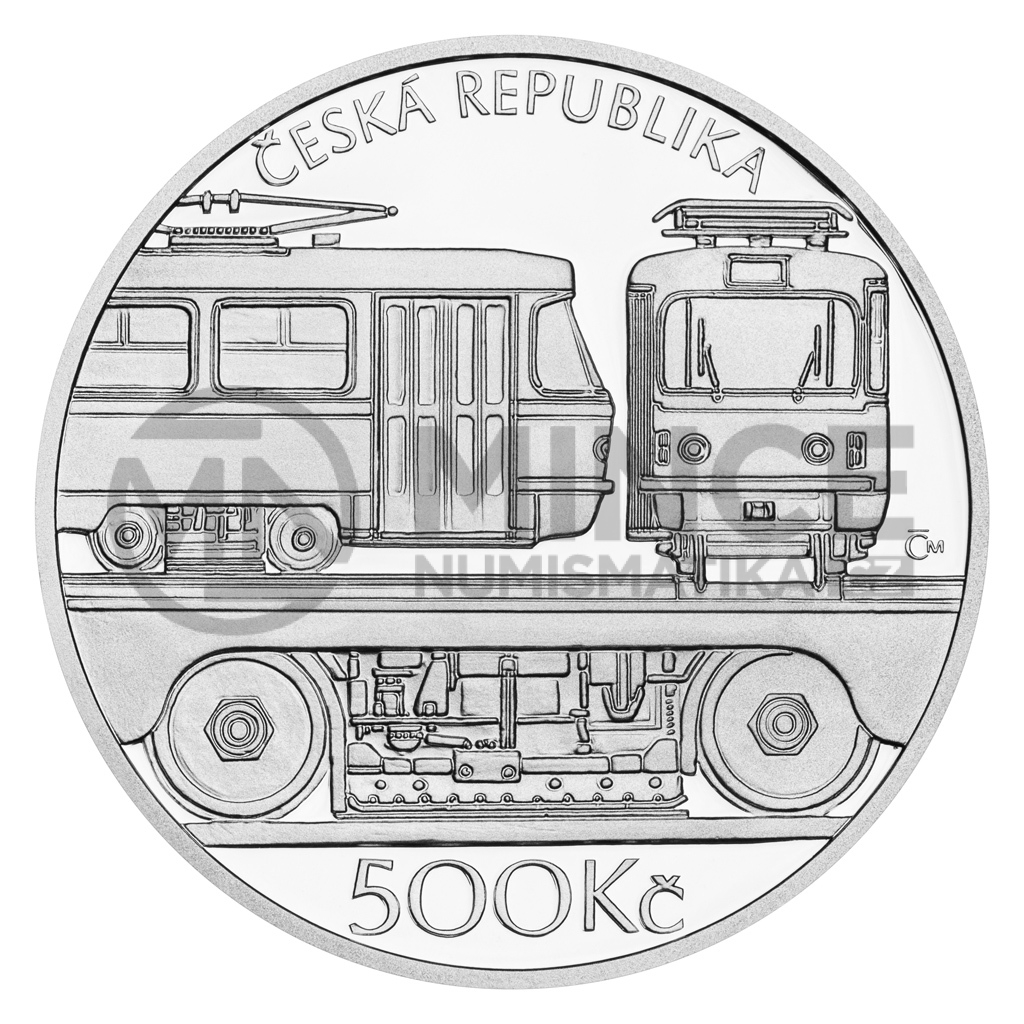 Na lícní straně pětisetkoruny je v horní části mince kompozice části bočního a čelního pohledu na tramvaj ČKD Tatra T3. V dolní části mince je zobrazen detail části podvozku. Při horním okraji mince je text „ČESKÁ REPUBLIKA“. Označení nominální hodnoty mince se zkratkou peněžní jednotky „500 Kč“ je při spodním okraji mince. Značka České mincovny, která je tvořena kompozicí písmen „Č“ a „M“, je při pravém okraji mince.