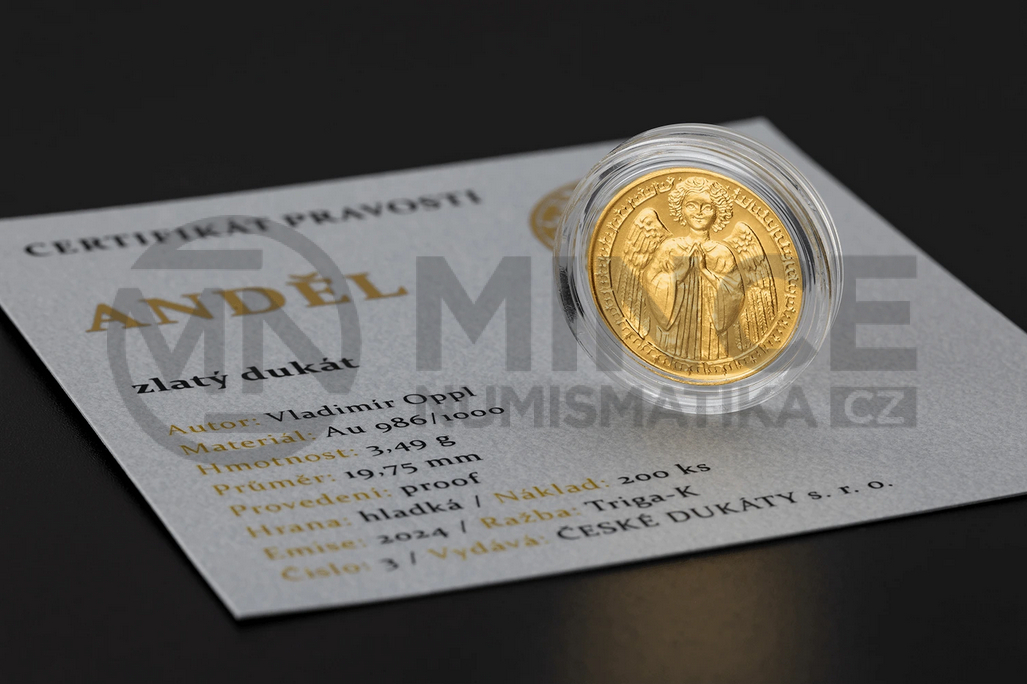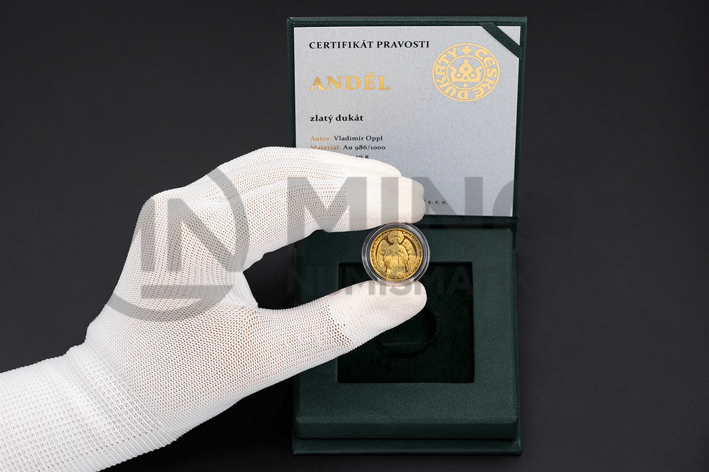 Královská koruna na reversu dukátu spojuje volný triptych „duchovních medailí“ sochaře Vladimíra Oppla. Anděl tak navazuje na předchozí ražby Bohorodičky s dítětem a Pražského Jezulátka.