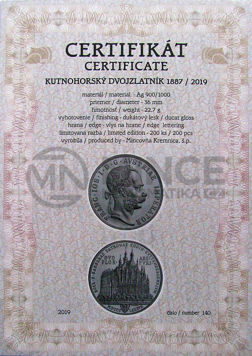 Novoražba pamětního Kutnohorského dvouzlatníku 1887 realizovaná v roce 2019 v Mincovně Kremnica š.p.