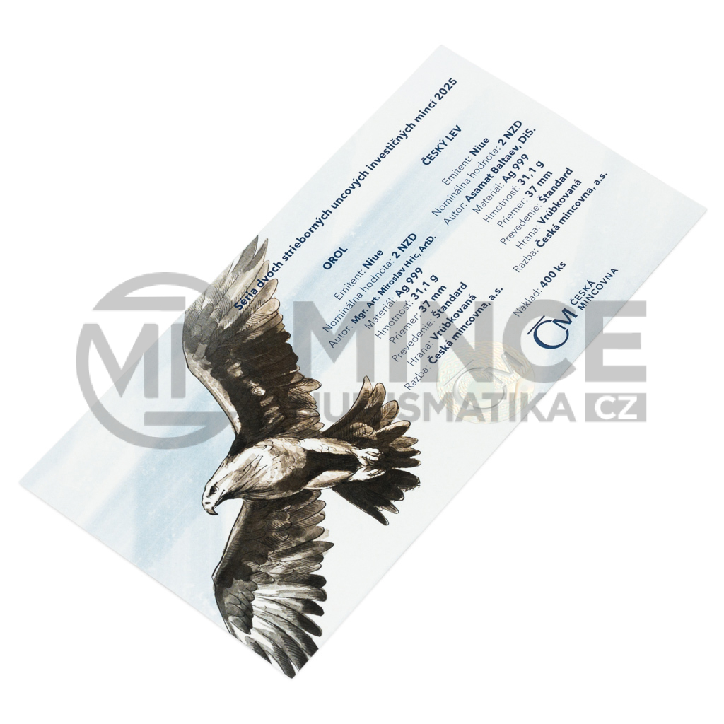 Sada, jejíž celková hmotnost čítá dvě trojské unce ryzího stříbra, obsahuje dvě investiční mince České mincovny – Českého lva a Orola s ročníkem 2025.