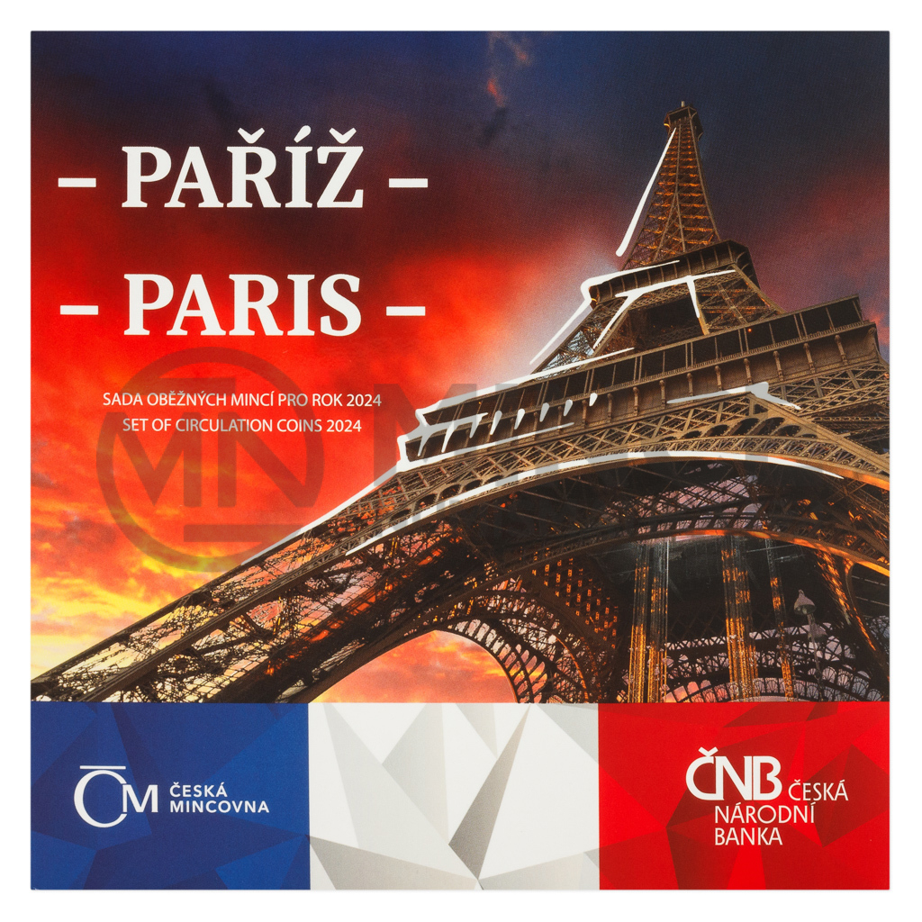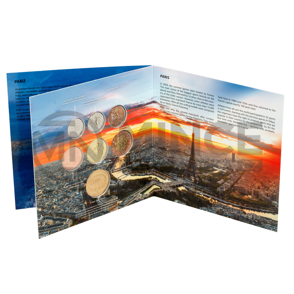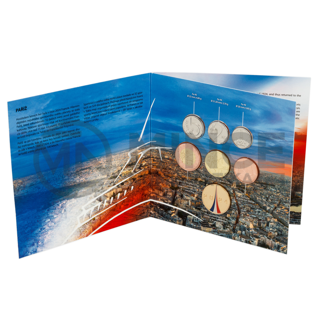 V sadě najdete šest oběžných mincí s nominálními hodnotami 1, 2, 5, 10, 20 a 50 Kč, které byly vyraženy v roce 2024 a neprošly oběhem. Dalším dílem skládanky je speciální pamětní žeton z dílny medailéra MgA. Martina Daška. Kolorovaná ražba nese francouzský národní stadion Stade de France a francouzskou trikoloru, jež svým tvarem evokuje Eiffelovu věž.