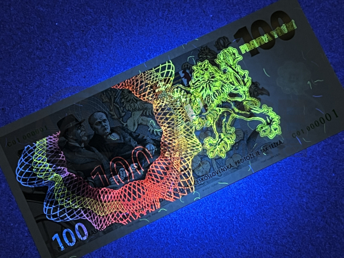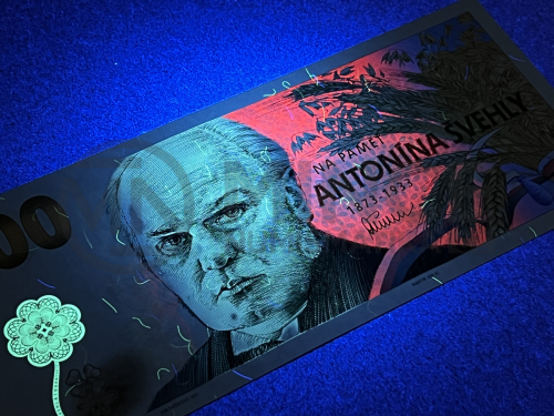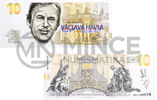 Ve spolupráci se Státní tiskárnou cenin jsme oslovili přední tvůrce českých bankovek: akademickou malířku Evu Haškovou a rytce Martin Srba. Vznikla bankovka o rozměrech 194x84 mm s portrétem Václava Havla, kterou zdobí též neobvyklé pohledy na Pražský hrad: na líci jižní křídlo s prezidentským balkonem a na rubu Matyášova brána se sousoším Titánů.