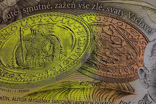 | Ochranné prvky | Ceninový papír s vodoznakem a barevnými vlákny Líc: ceninové podtiskové rastry, irisové přechody, dvoubarevná fluorescence pod UV lampou v irisovém přechodu, skrytý obrazec s iniciály VH Rub: ceninové podtiskové rastry, irisové přechody, dvoubarevná fluorescence pod UV lampou v irisovém přechodu, pyramidální číslování se zelenou fluorescencí pod UV lampou |