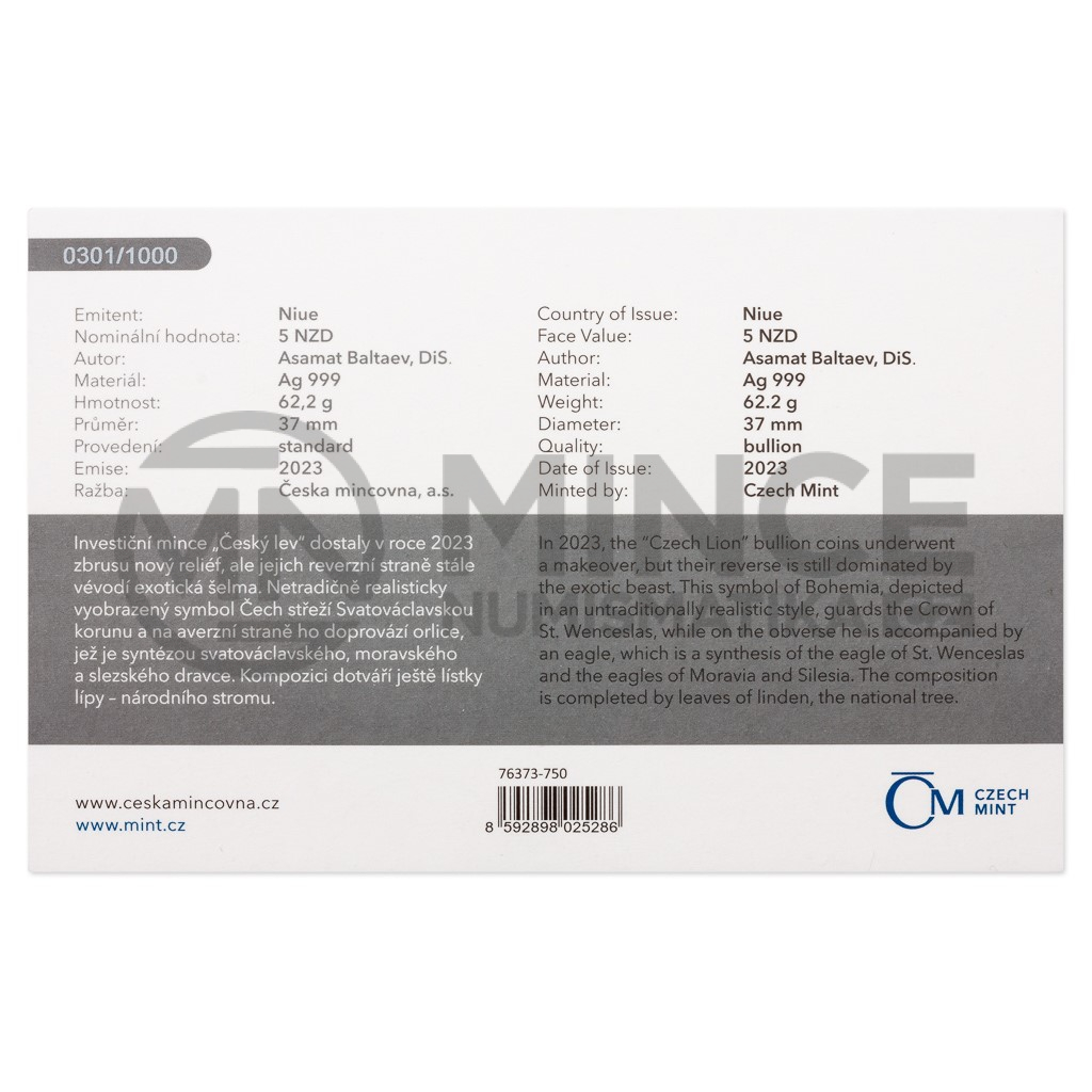Světové investiční mince bývají věnovány silným národním symbolům a ani „Český lev“, který je první ražbou svého druhu určenou pro český trh, není výjimkou. Hmotnost stříbrné mince České mincovny s ročníkem 2023 činí dvě trojské unce.