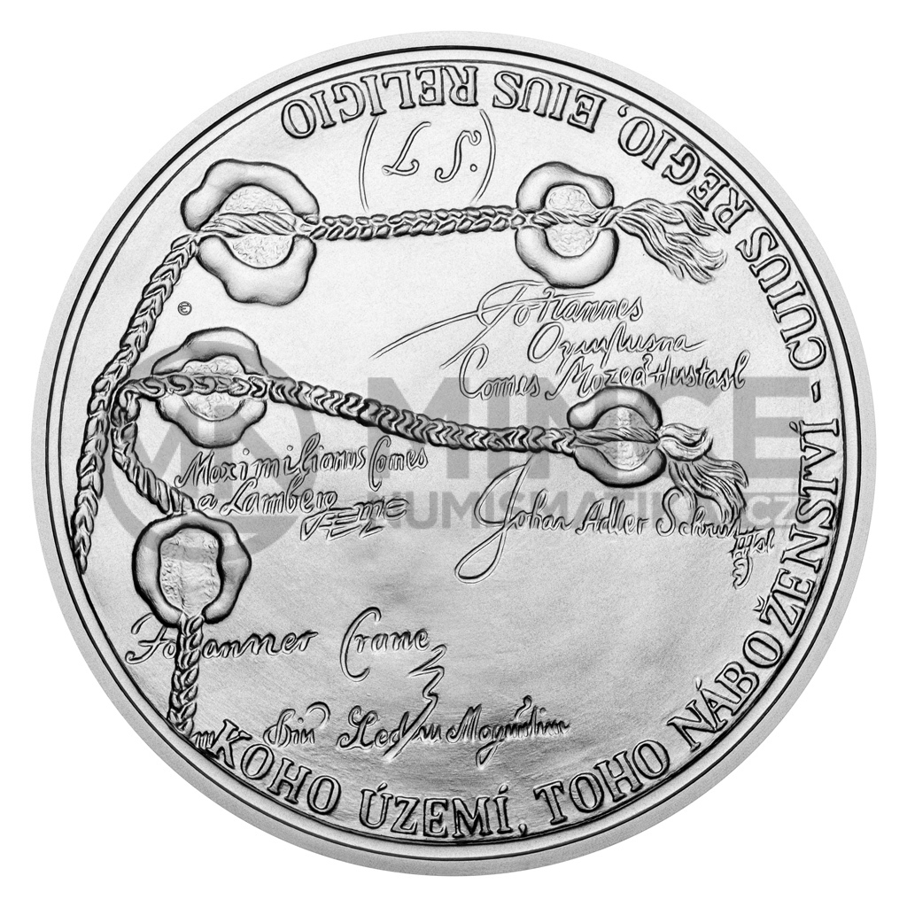Medailérka MgA. Tereza Eisnerová věnovala averzní stranu medaile třem klíčovým aktérům vestfálského míru, kterými byli římský císař Ferdinand III., francouzský král Ludvík XIV. a kardinál Jules Mazarin. Dvouřádkový opis uvádí VESTFÁLSKÝ MÍR – 24. ŘÍJNA 1648. Reverzní strana pak připomíná, že mír byl souborem dvou smluv – Münsterské a Osnabrücké. Latinská fráze CUIUS REGIO, EIUS RELIGIO – v češtině KOHO ÚZEMÍ, TOHO NÁBOŽENSTVÍ – zjednodušeně popisuje právní princip, který po skončení třicetileté války stanovil, že panovník je oprávněn zvolit si náboženské vyznání pro své území.