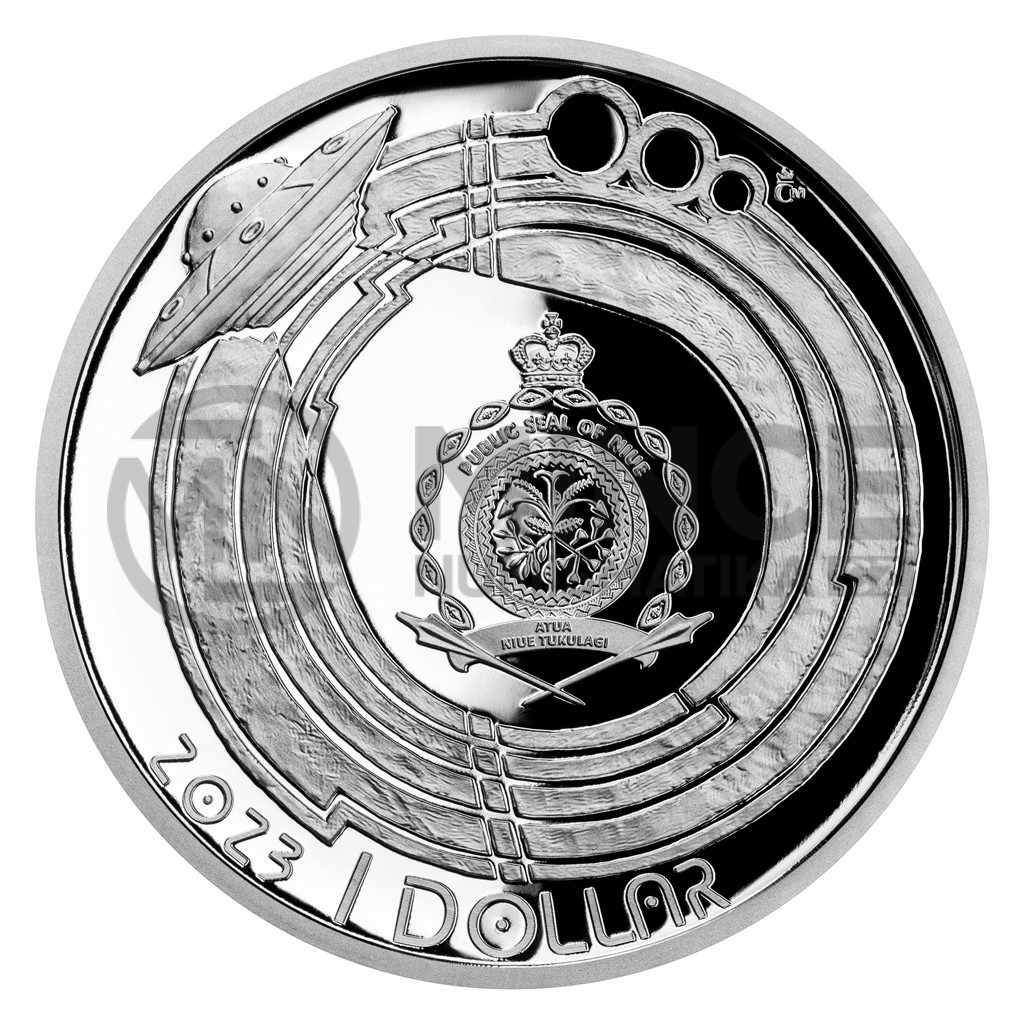Reverzní stranu mince věnoval medailér Asamat Baltaev, DiS., věrnému portrétu československého kosmonauta ve skafandru. V pozadí se vyjímá kosmická loď Sojuz 28 připravená ke startu, jejíž trup lemuje jméno VLADIMÍR REMEK. Kompozici dotvářejí ještě stylizované vesmírné objekty – hvězdy a planety. Averzní strana mince vtipně předkládá kruhy v obilí a létající talíř, který osvětluje státní znak ostrova Niue. Ten je spolu s letopočtem emise 2023 a nominální hodnotou 1 DOLLAR (NZD) nezbytným atributem zahraničního emitenta mince – tichomořského ostrova, který České mincovně poskytuje licenci k ražbě vlastních pamětních mincí.