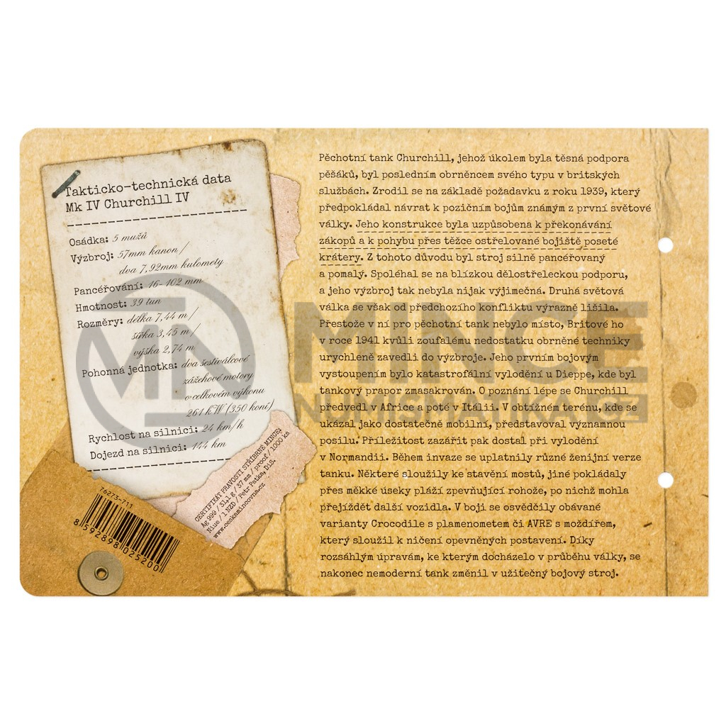 Pěchotní tank Churchill, jehož úkolem byla těsná podpora pěšáků, byl posledním obrněncem svého typu v britských službách. Zrodil se na základě požadavku z roku 1939, který předpokládal návrat k pozičním bojům známým z první světové války. Jeho konstrukce byla uzpůsobena k překonávání zákopů a k pohybu přes těžce ostřelované bojiště poseté krátery. Z tohoto důvodu byl stroj silně pancéřovaný a pomalý. Spoléhal se na blízkou dělostřeleckou podporu, a jeho výzbroj tak nebyla nijak výjimečná. Druhá světová válka se však od předchozího konfliktu výrazně lišila. Přestože v ní pro pěchotní tank nebylo místo, Britové ho v roce 1941 kvůli zoufalému nedostatku obrněné techniky urychleně zavedli do výzbroje. Prvotní výsledky byly nevalné – nechvalně proslulé vylodění u Dieppe skončilo katastrofou –, ale Churchill byl průběžné modernizován a nakonec se změnil v užitečný bojový stroj. Osvědčil se při tažení v Africe, Itálii a Normandii, kde se uplatnila řada vynalézavých variant. Například ženijní typ AVRE, který s pomocí moždíře dokázal bořit bunkry, nebo Crocodile, jehož plamenomet chrlil oheň na vzdálenost 110 metrů.