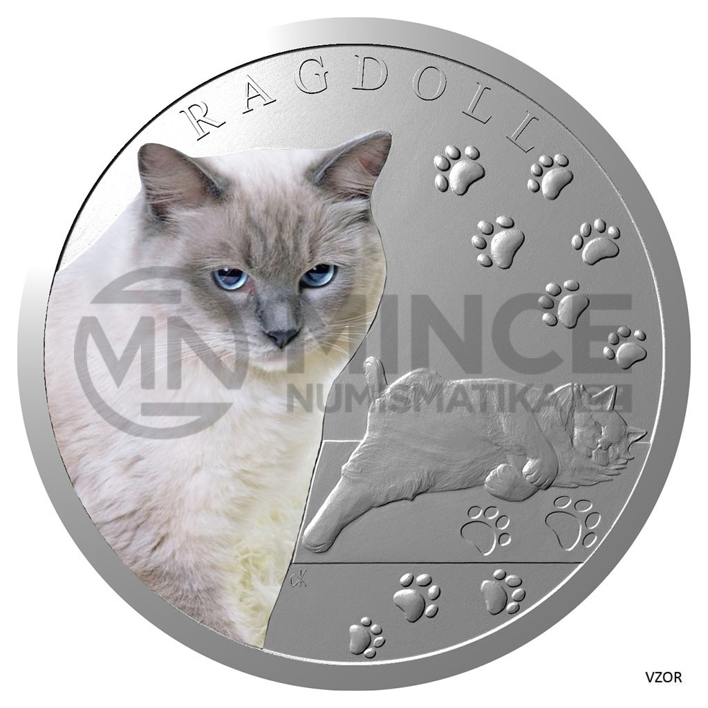 Na páté stříbrné minci České mincovny z cyklu Plemena koček se objevuje ragdoll.