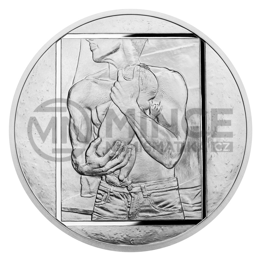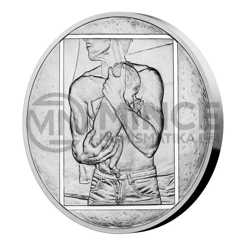 Dílo Jana Saudka je kontroverzní a provokativní oslavou lidství. Je smyslné, živočišné, erotické, až perverzní. Jeho nejčastějším předmětem je ženství, jenže to neznamená, že by se v něm nenašlo místo pro mužnost. Maskulinní umělec se opakovaně vrací k problematice vztahů mezi muži a ženami, které jsou plné lásky i nenávisti, ale také k tematice otcovství, která je mu dobře známá. Fotografie Život z roku 1966, která inspirovala stejnojmenné obrazy, předkládá samotného autora coby otce. Bytost důvěrná a nahá – zbavená šatu, který mu oblékla společnost – si k hrudi tiskne bezbranné dítě. Těsná blízkost mezi dvěma stvořeními nás vybízí k zamyšlení nad tím, odkud jsme vzešli a kam směřujeme. Ikonické dílo, které je křehké a intimní, a přece silné a intenzivní, inspirovalo druhou pamětní medaili, jež vznikla ve spolupráci s Janem Saudkem…