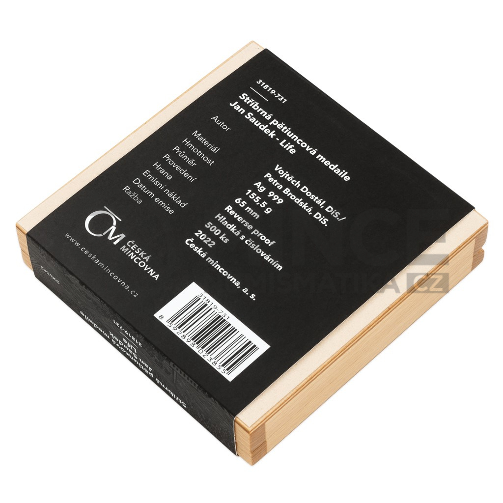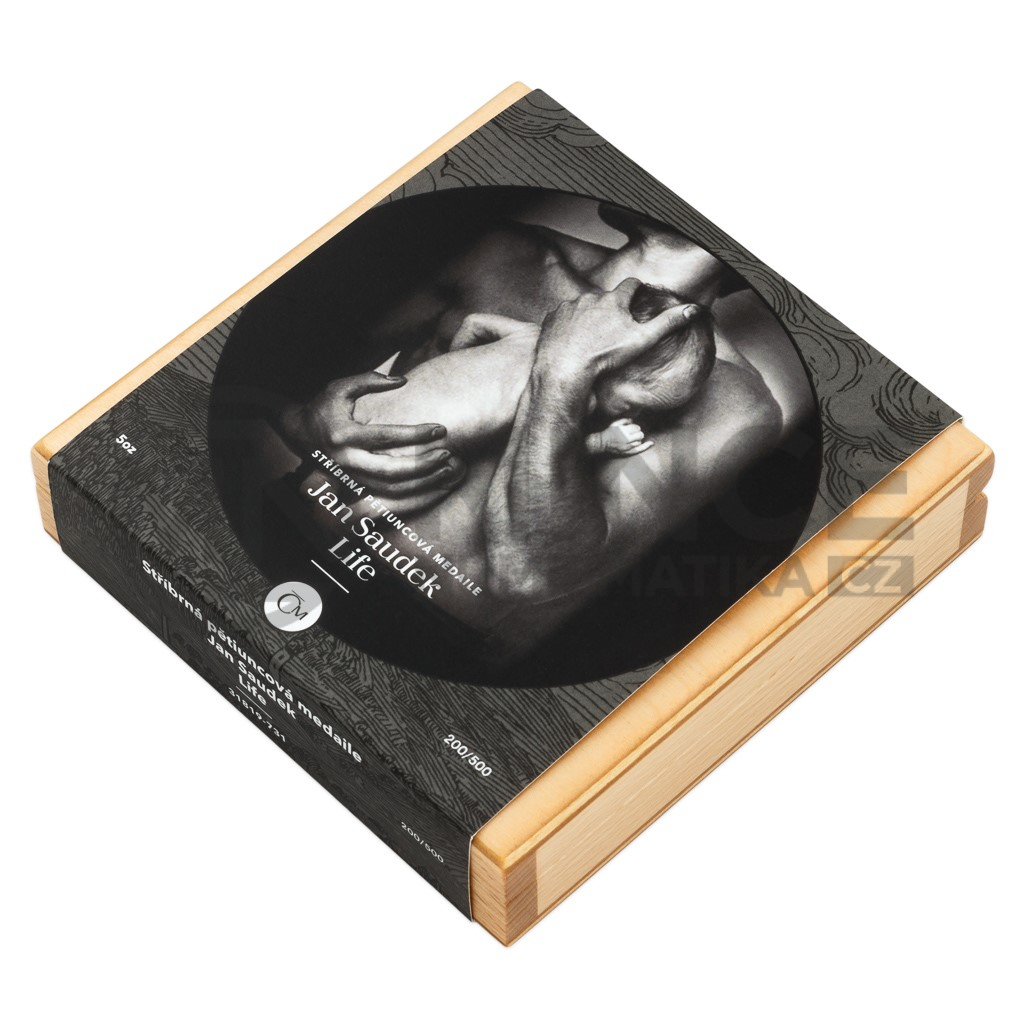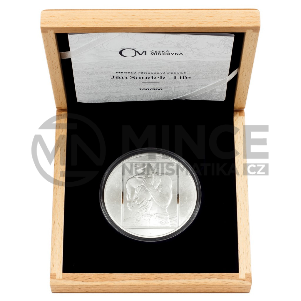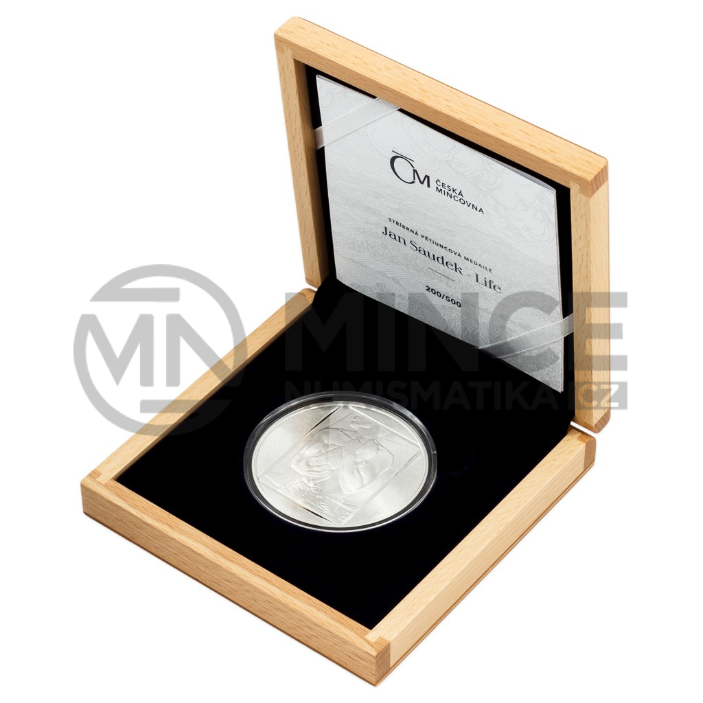 Janu Saudkovi vzdává hold již druhá stříbrná medaile České mincovny – tentokrát o hmotnosti pěti trojských uncí. Jejím hlavním motivem je fotografie s názvem Život.