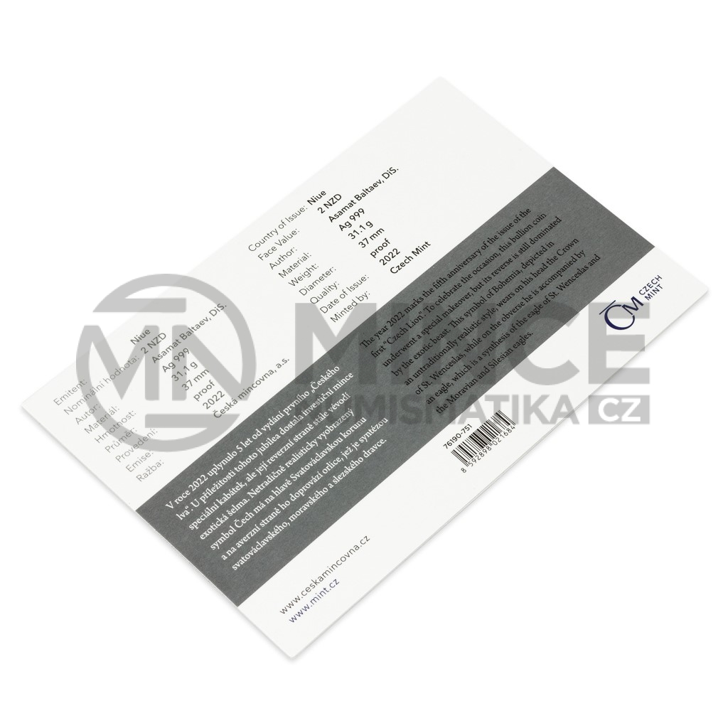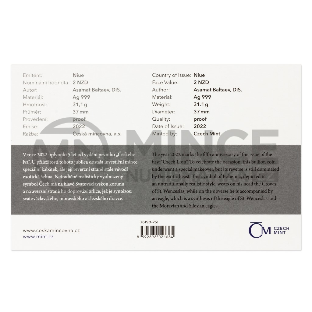 Světové investiční mince bývají věnovány silným národním symbolům a ani „Český lev“, který je první ražbou svého druhu určenou pro český trh, není výjimkou. Hmotnost stříbrné mince České mincovny s ročníkem 2022 činí jednu trojskou unci.