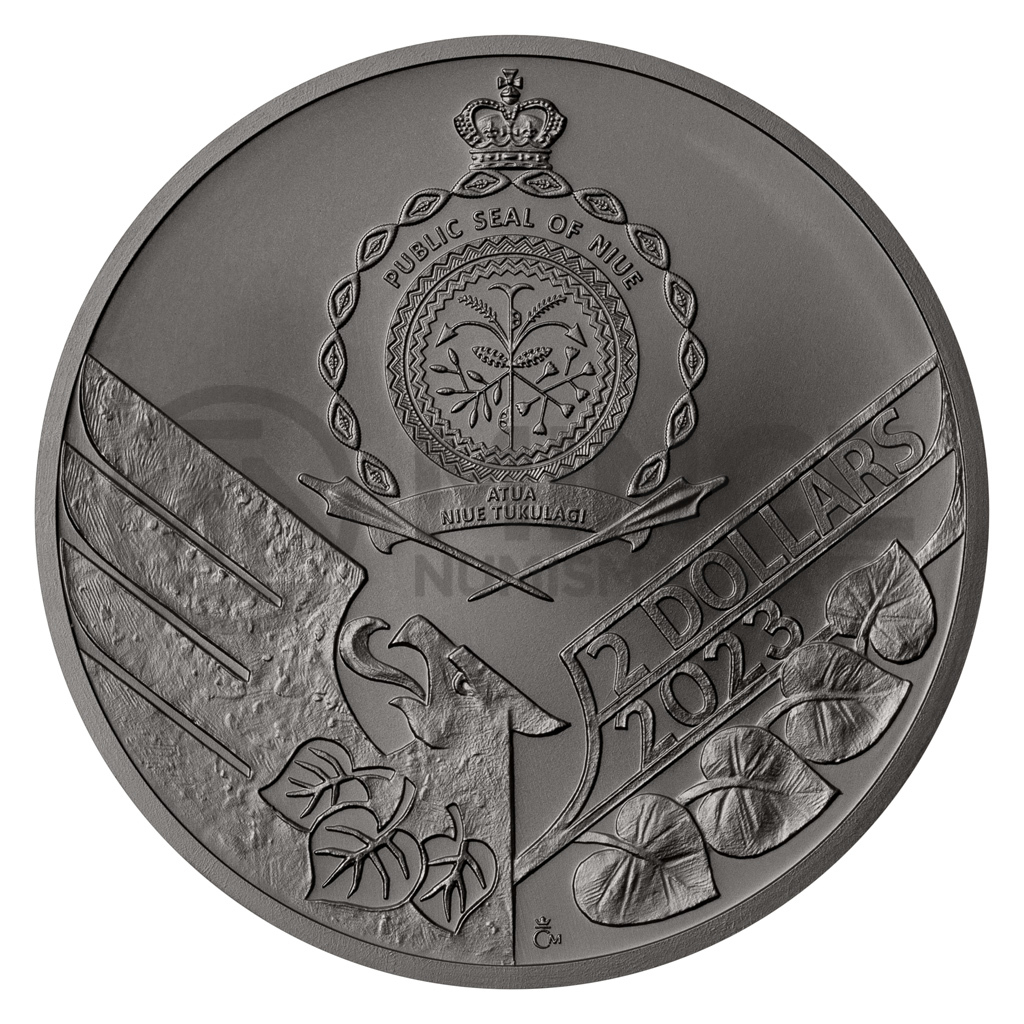 Reverzní straně mince vévodí pozlacený motiv – netradičně realisticky zpracovaný český lev, který střeží Svatováclavskou korunu. Averzní strana pak předkládá lipové ratolesti a orlici, jež je syntézou svatováclavského, moravského a slezského dravce. Autorem reliéfu je již tradičně medailér Asamat Baltaev, DiS. Protože mince České mincovny vycházejí v licenci zahraničního emitenta, kterým je ostrov Niue, jejich averzní strana nese ještě jeho nezbytné atributy – státní znak, nominální hodnotu 2 DOLLARS (NZD) a rok emise 2023.
