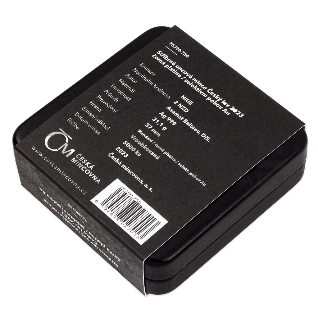 Mimořádná varianta investiční mince Český lev vyniká promyšlenou hrou barev, jež se v mincovnictví často nevidí. Stříbrná ražba je pokryta vrstvičkou černé platiny – ušlechtilého materiálu, který se ve srovnání se stříbrem či zlatem vyznačuje vyšší tvrdostí, hustotou i odolností. Ústřední reliéf je pak ještě selektivně pozlacen, což minci propůjčuje výrazný kontrastní vzhled.
