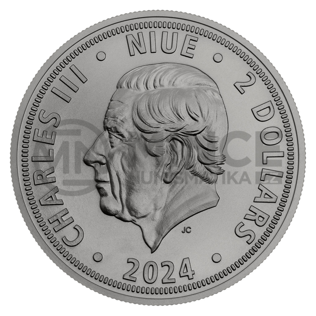 Reverzní straně mince vévodí český lev v realistickém podání, který má na hlavě Svatováclavskou korunu. Doplňkovým motivem je orlice, jež je syntézou svatováclavského, moravského a slezského dravce. Nápis ČESKÁ REPUBLIKA je umístěn do klínu, který evokuje českou vlajku. Autorem reliéfu je již tradičně medailér Asamat Baltaev, DiS. Protože mince České mincovny vycházejí v licenci zahraničního emitenta, kterým je ostrov Niue, jejich averzní strana nese jeho nezbytné atributy – portrét krále Karla III., nominální hodnotu 2 DOLLARS (NZD) a rok emise 2024.