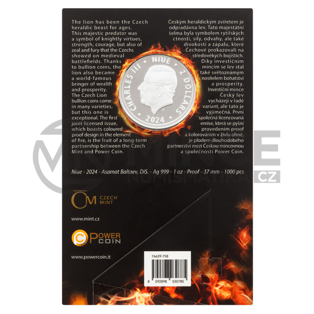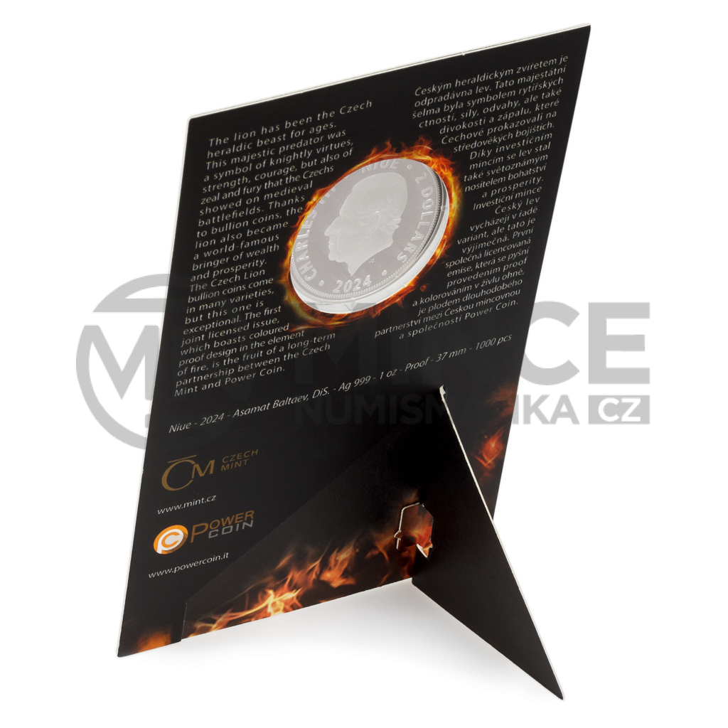 Českým heraldickým zvířetem je odpradávna lev. Tato majestátní šelma byla symbolem síly a odvahy, ale také divokosti a zápalu, které Čechové prokazovali na středověkých bojištích. Díky investičním mincím se lev stal také světoznámým nositelem bohatství a prosperity. Investiční mince Český lev vycházejí v řadě variant, ale tato uncová stříbrná ražba je výjimečná. První společná licencovaná emise, která se pyšní provedením proof a kolorováním v živlu ohně, je plodem dlouhodobého partnerství mezi Českou mincovnou a italskou společností Power Coin.