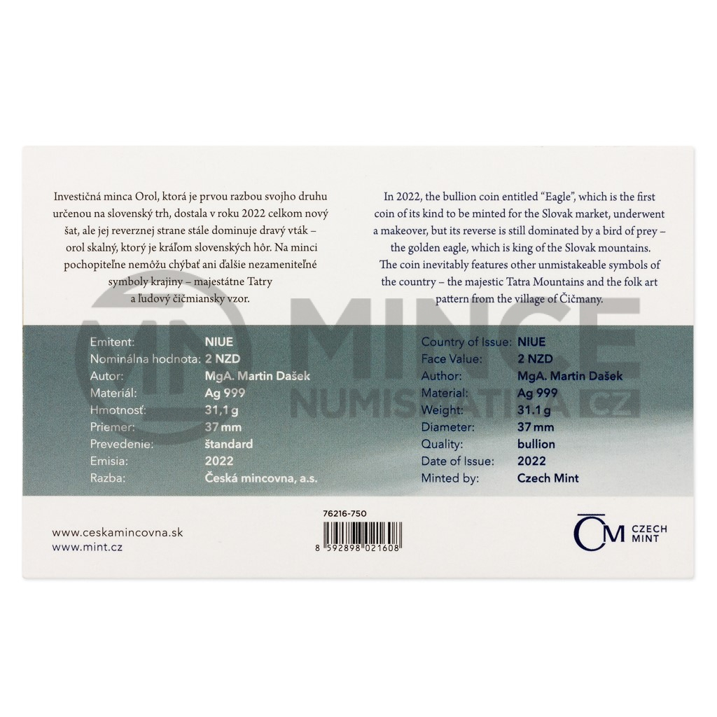 Světové investiční mince bývají věnovány silným národním symbolům a ani „Orol“, který je první ražbou svého druhu určenou pro slovenský trh, není výjimkou. Hmotnost stříbrné mince České mincovny s ročníkem 2022 činí jednu trojskou unci.