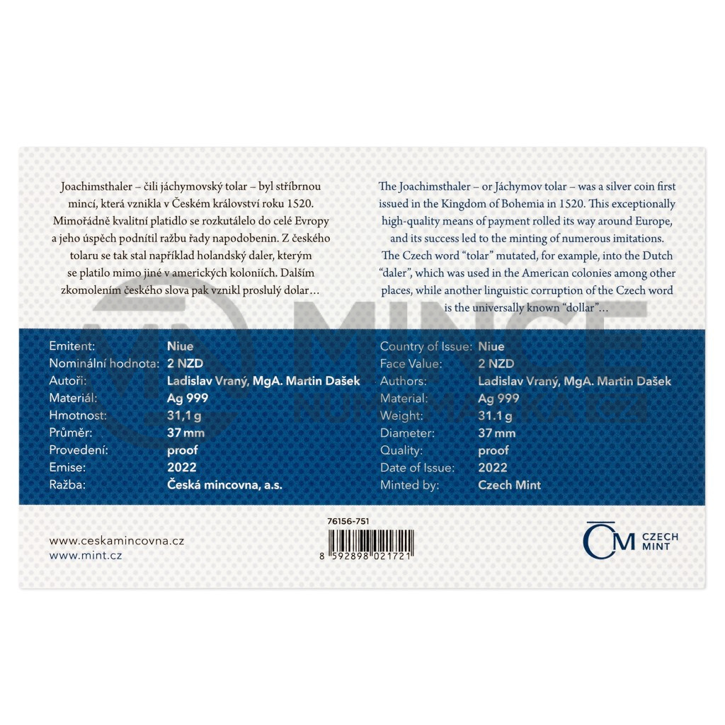 Zatímco reverzní strana mince, která je dílem designéra Ladislava Vraného a medailéra MgA. Martina Daška, předkládá tři jáchymovské tolary, na averzu najdete trojici amerických dolarů. Konkrétně se jedná o motiv úplně prvních mincí ražených Spojenými státy v roce 1794, které si od svého českého prapředka vypůjčily nejen jméno, ale také váhu a ryzost použitého kovu. Protože mince České mincovny vycházejí v licenci zahraničního emitenta, kterým je ostrov Niue, jejich averzní strana nese ještě jeho nezbytné atributy – státní znak, nominální hodnotu 2 DOLLARS (NZD) a rok emise 2022.