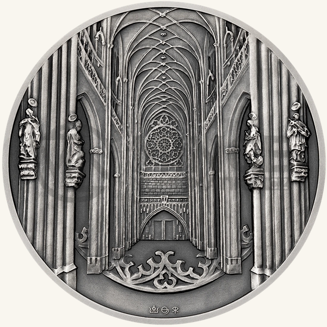 Averzní strana medaile zobrazuje velmi tradiční, avšak impozantní boční pohled na západní vstupní portál katedrály a reverzní straně vévodí hlavní loď chrámu s pohledem k západnímu vrcholu.