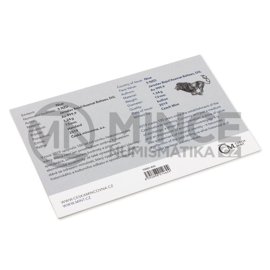 Vlastenecký reliéf investičních mincí České mincovny je inspirován tradičními symboly České republiky. Reverzní strana předkládá netradičně realisticky zpracovaného dvouocasého lva, který střeží Svatováclavskou korunu a svatováclavskou orlici na štítu. Averzní strana pak nese atributy ostrova Niue – portrét a jméno královny Alžběty II., rok emise 2019 a nominální hodnotu 5 DOLLARS (NZD) –, který České mincovně poskytuje zahraniční licenci k ražbě vlastních mincí. Kompozici averzu doplňuje ještě lipová ratolest. Mince má hned dva autory. Navrhl ji přední výtvarník Jaroslav Bejvl, který však ve věku 75 let zemřel a už ji nestihl dokončit. V jeho díle proto pokračuje nadaný medailér Asamat Baltaev, DiS.