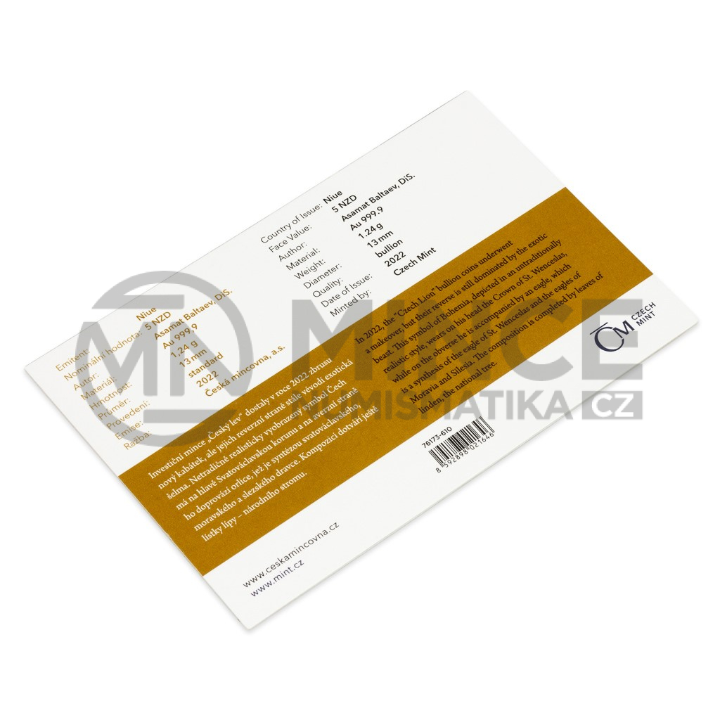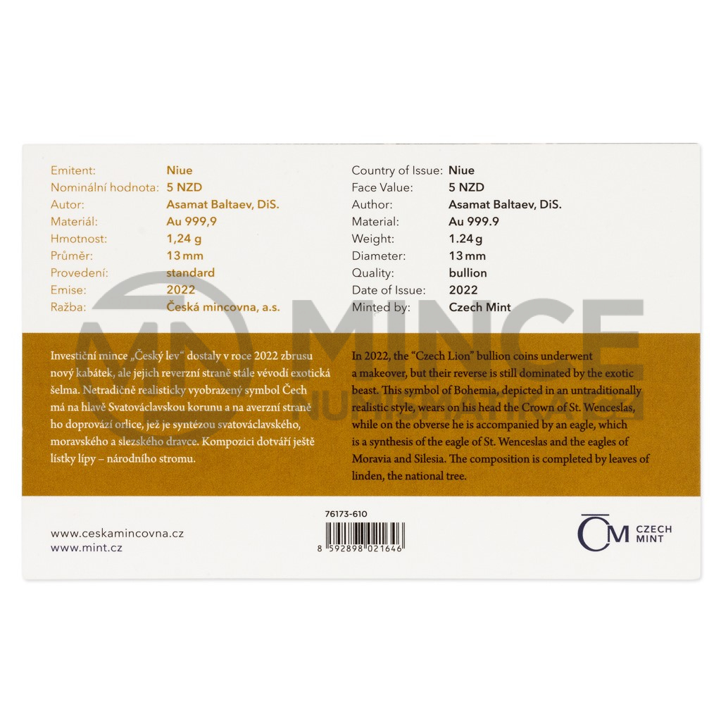 Světové investiční mince bývají věnovány silným národním symbolům a ani „Český lev“, který je první ražbou svého druhu určenou pro český trh, není výjimkou. Hmotnost zlaté mince České mincovny s ročníkem 2022 činí jednu pětadvacetinu trojské unce.