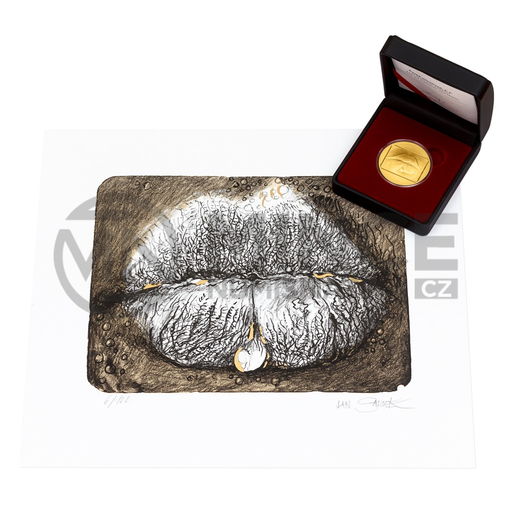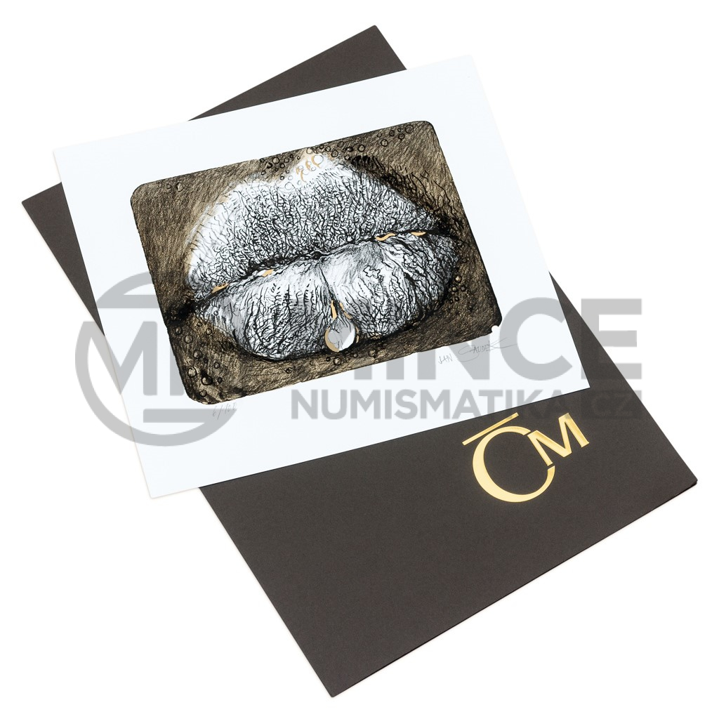 Nedílnou součástí zlaté medaile, která vychází v nákladu čítajícím pouhých 100 číslovaných kusů, je originální grafický list – jak jinak než s motivem smyslných rtů…