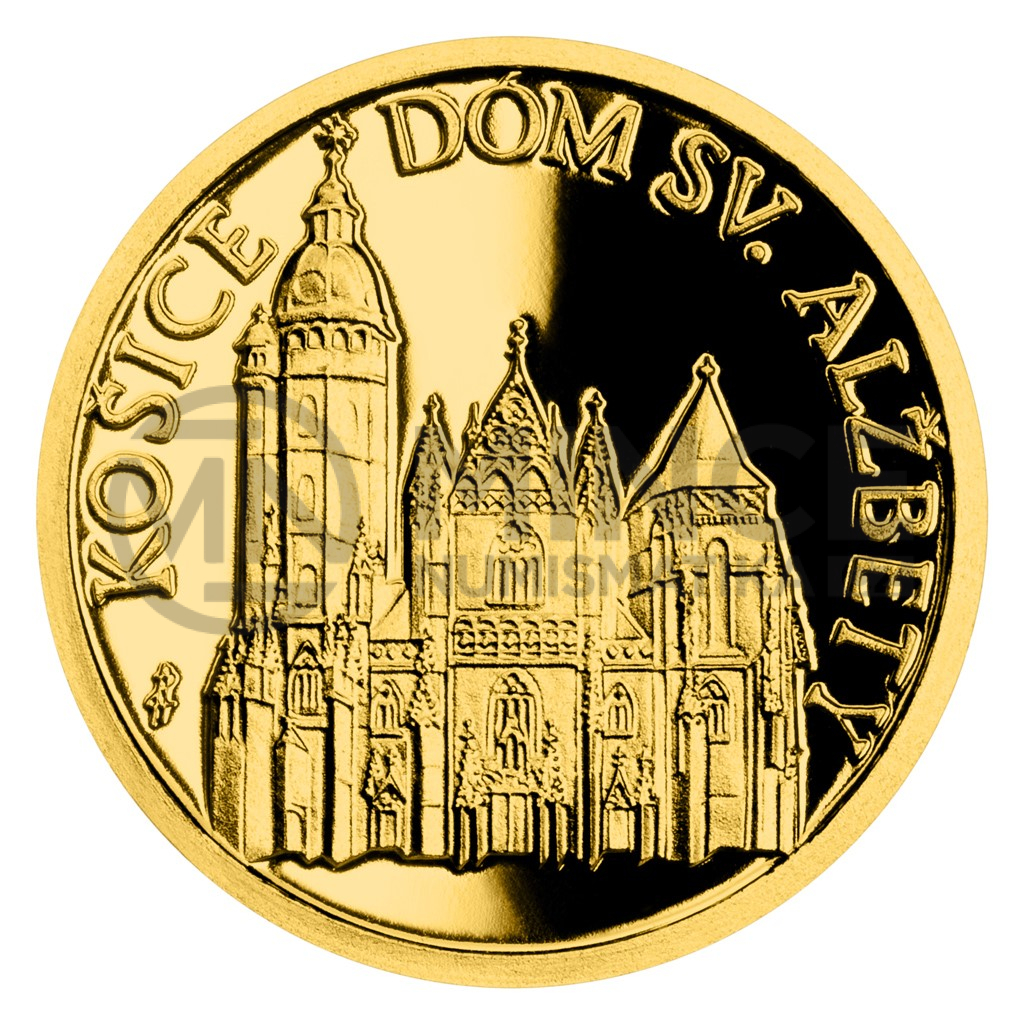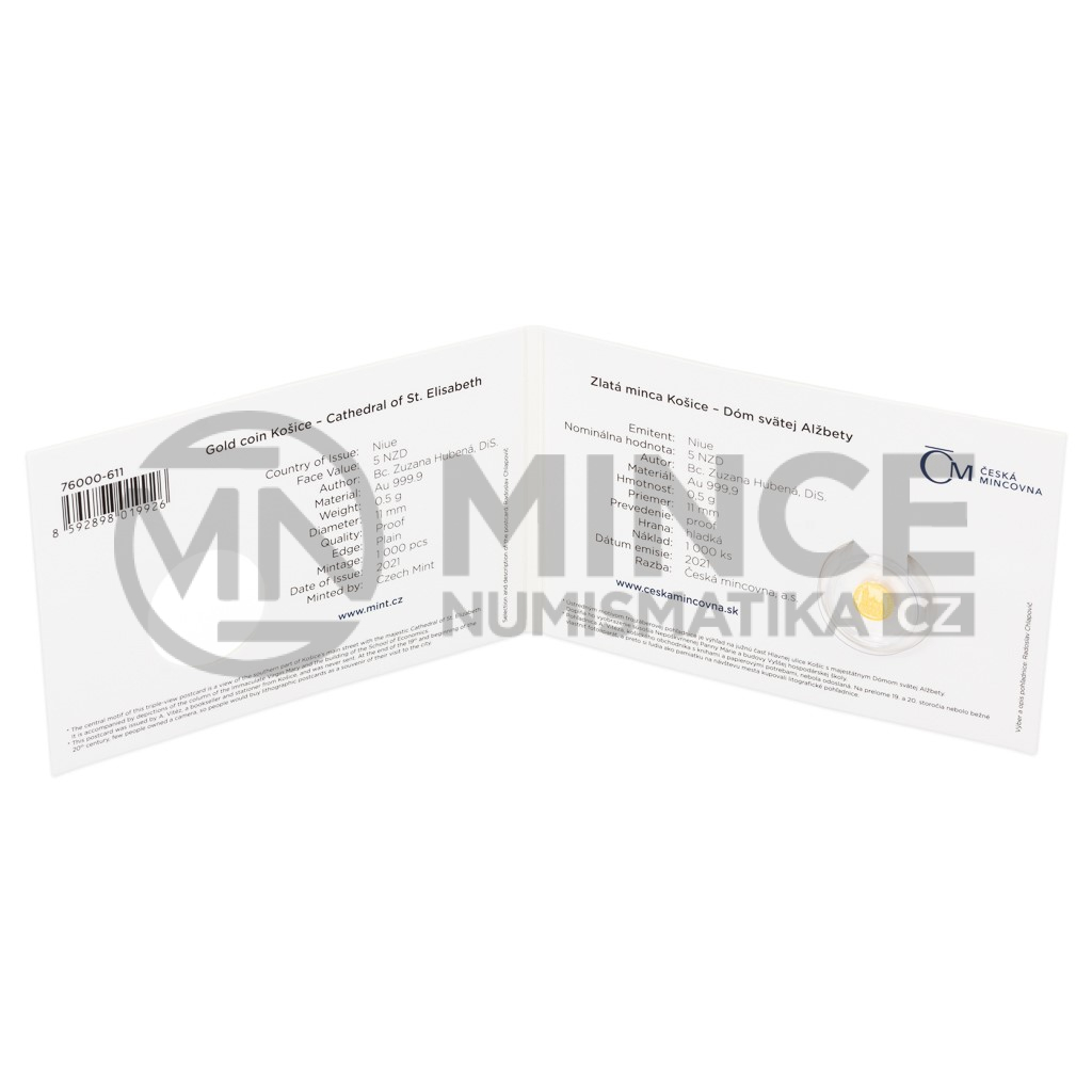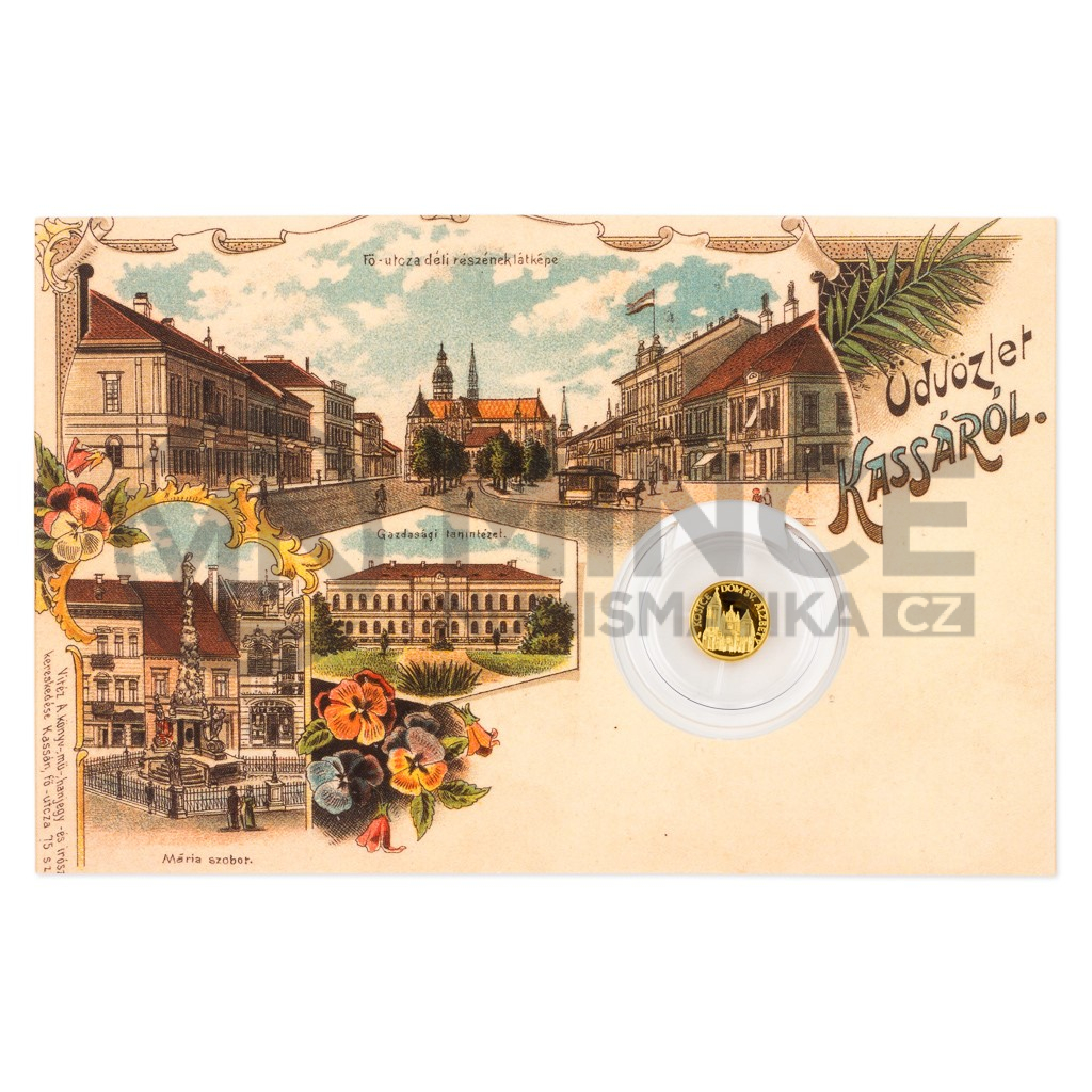 Pátá zlatá minimince České mincovny zasazená do repliky historické pohlednice se slovenským motivem připomíná Košice a jejich katedrálu svaté Alžběty.