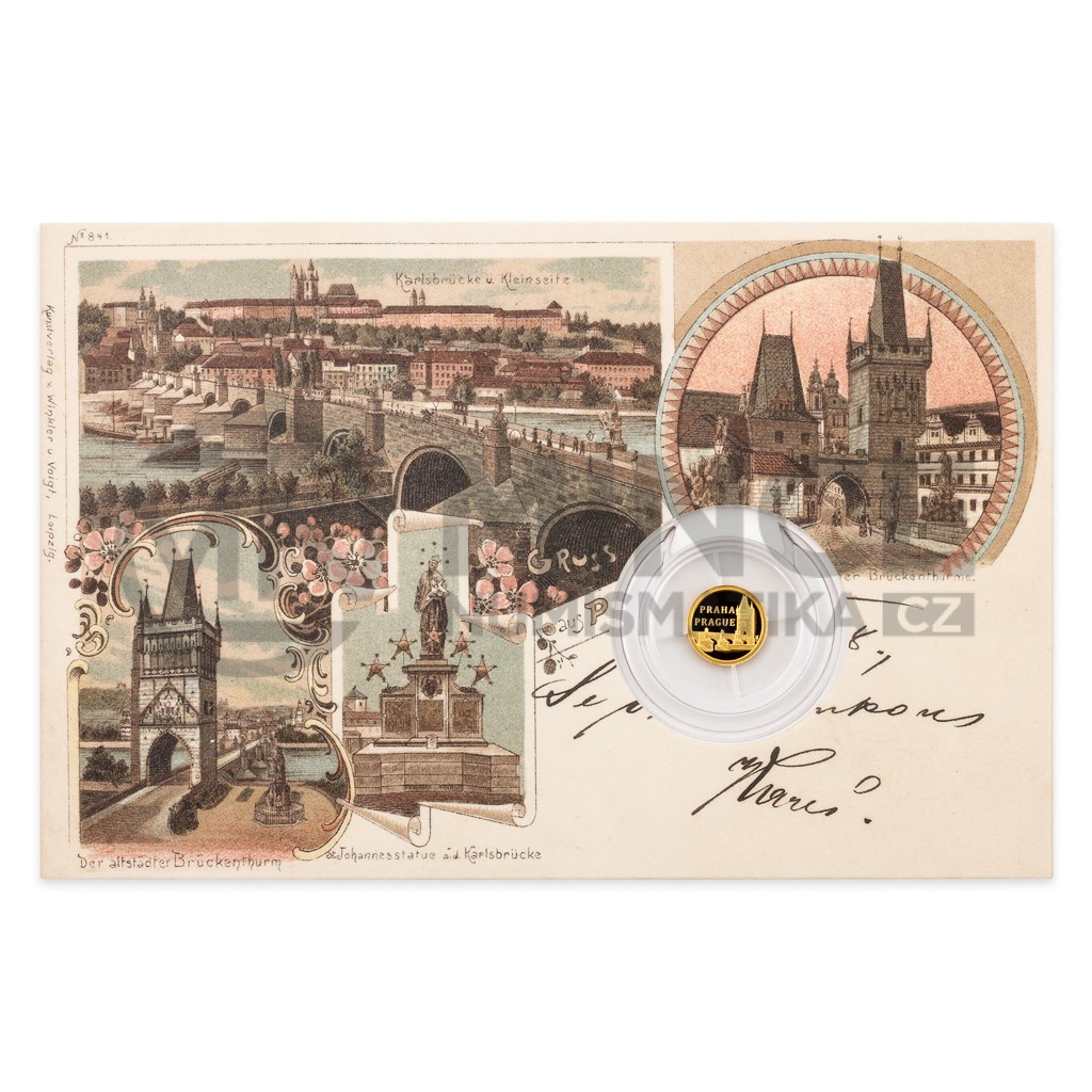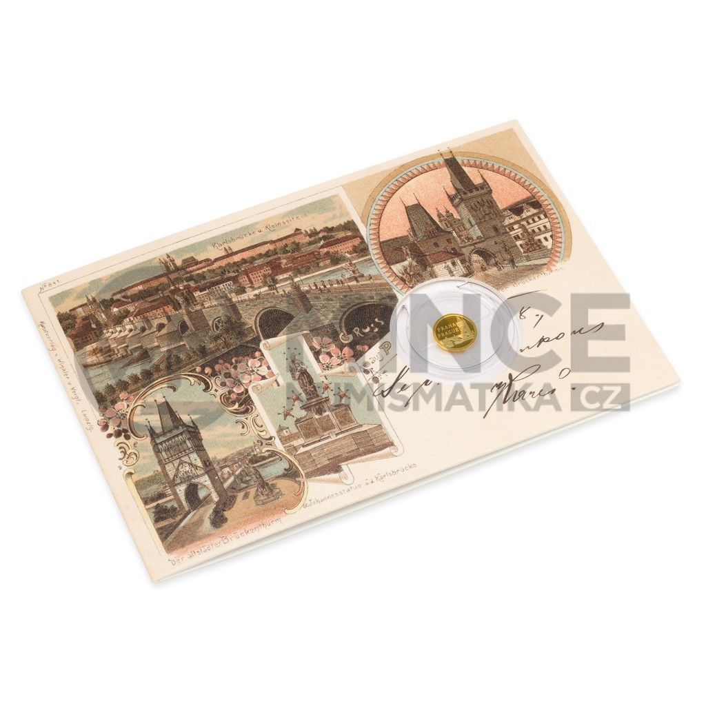 Čtvrtá zlatá mince České mincovny o hmotnosti jedné poloviny gramu je již tradičně uložena do repliky dobové litografické pohlednice. Emise, která potěší numismatiky i filokartisty, je věnována proslulému Karlovu mostu.