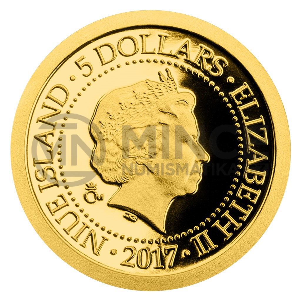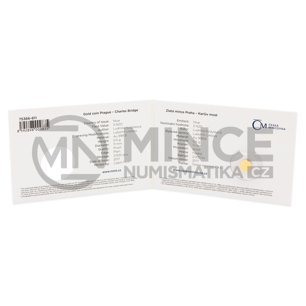 Reliéf zlaté minimince je dílem talentované mladé medailérky Ludmily Kodytkové. Reverzní stranu věnovala pohledu na Karlův most s jeho gotickou Staroměstskou věží a dvojjazyčnému nápisu PRAHA – PRAGUE. Averzní strana pak náleží atributům ostrova Niue, emitenta, který České mincovně poskytuje licenci k ražbě vlastních pamětních mincí. Jsou jimi jméno a portrét panovnice Alžběty II., rok vydání 2017 a nominální hodnota 5 DOLLARS (NZD).