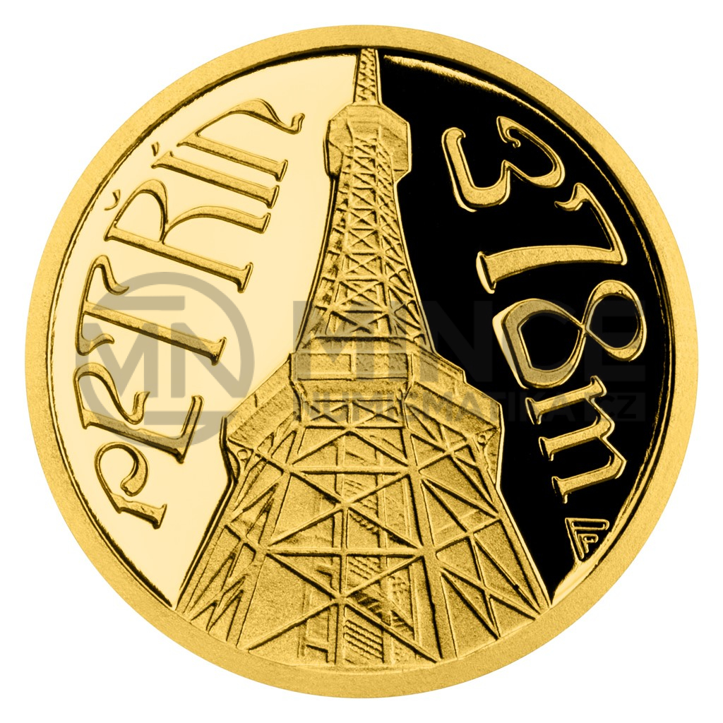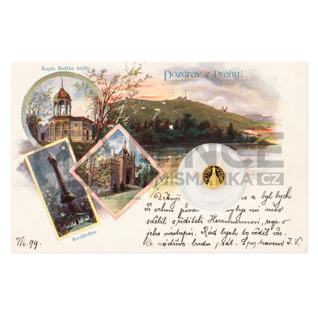 Další pražskou památkou, která se objevuje na zlaté miniminci České mincovny zasazené do repliky historické pohlednice, je Petřínská rozhledna.