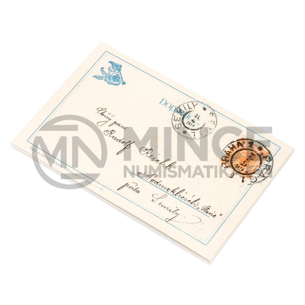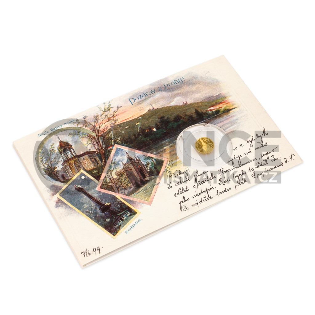 Petřínská rozhledna vznikla díky úsilí Klubu českých turistů u příležitosti Zemské jubilejní výstavy v roce 1891. Přestože byla atraktivním přírůstkem pražského panoramatu, nestala se na konci 19. století námětem mnoha vícezáběrových pohlednic… Pohlednice, která posloužila jako předloha balení mince, předkládá nejen moderní vyhlídkovou věž, ale také kapli na petřínské křížové cestě a proslulé zrcadlové bludiště. Pohlednici akademického malíře Pavla Körbera vydal významný český nakladatel Alois Wiesner. V roce 1899 byla odeslána z Prahy do Podmoklic u Semil.