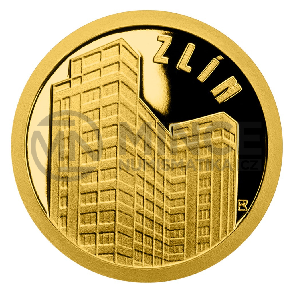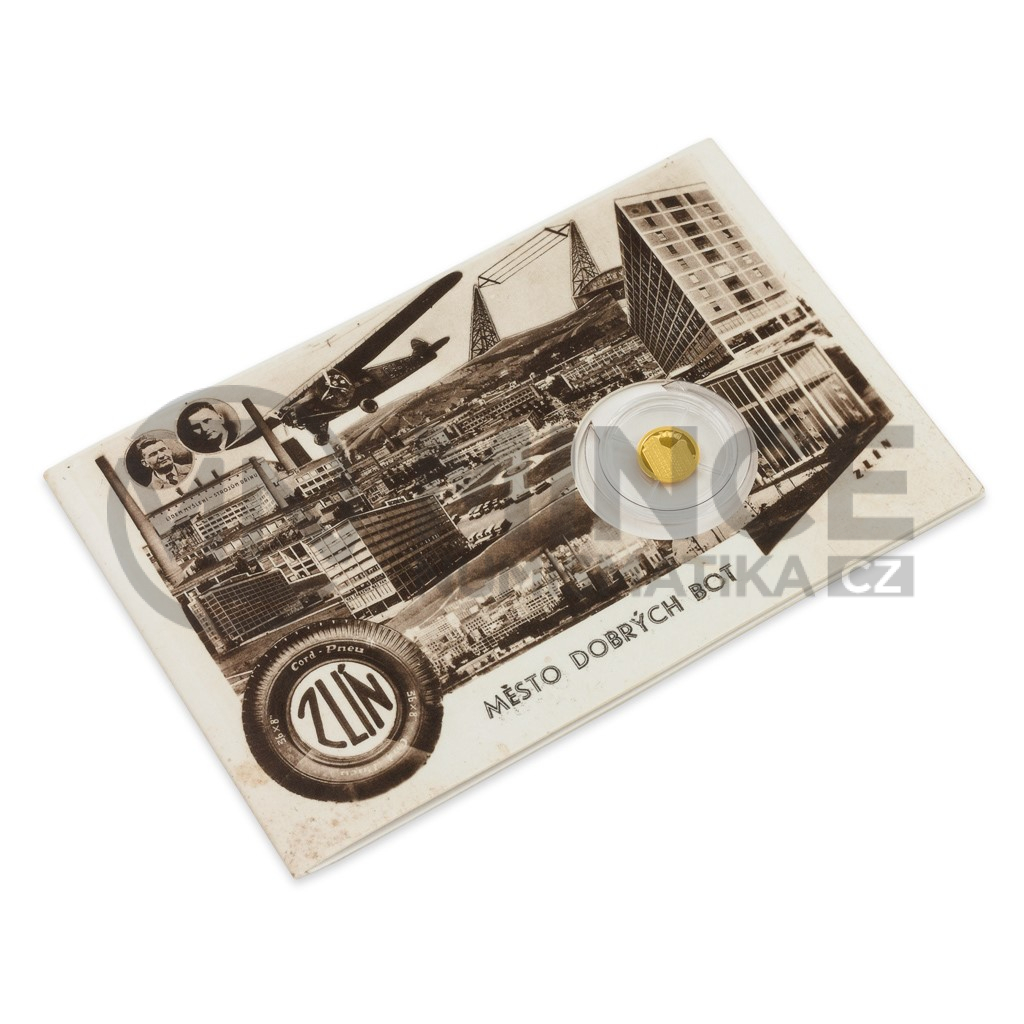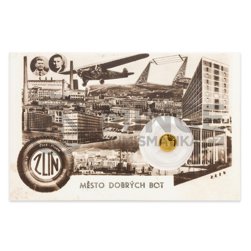 Další zlatá mince České mincovny o hmotnosti jedné poloviny gramu, která je uložena do repliky dobové pohlednice, je věnována městu Zlín. Přestože se první zmínky o Zlínu datují již do 14. století, všichni si ho spojujeme s překotným rozvojem ve 20. století, a tak minci vévodí proslulý Baťův mrakodrap.